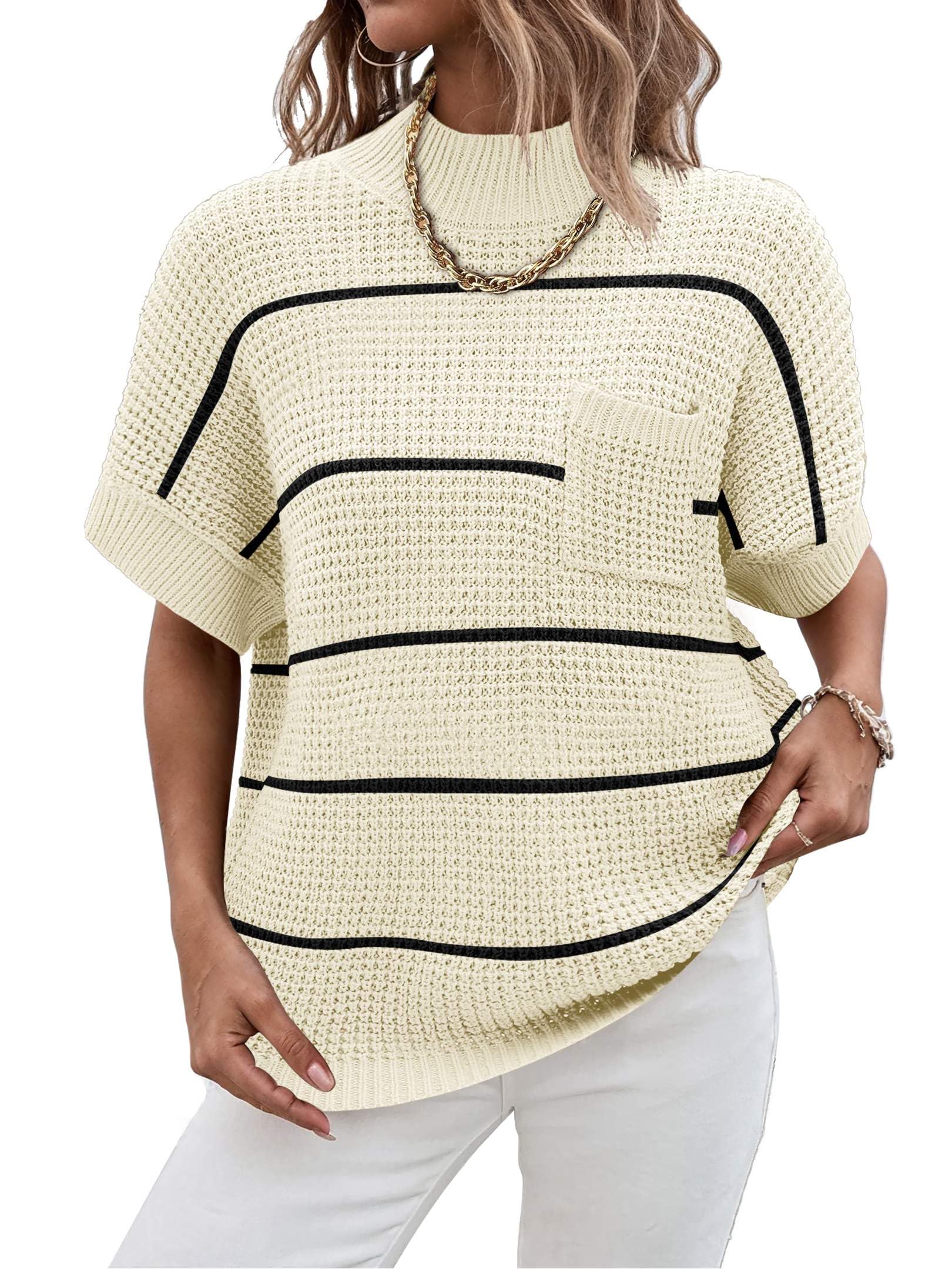 FEATURES: Crew Neck /stripe /loose Fit /Lightweight Knit Sweater/Cap Sleeve