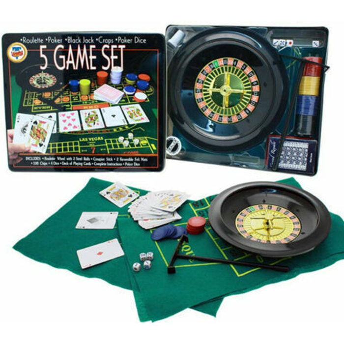 Con 5 giochi classici in 1 set – Roulette, Poker, Black Jack, Craps e Poker Dice – avrai tutto il necessario per ricreare l’atmosfera di un vero casinò direttamente nel salotto di casa.