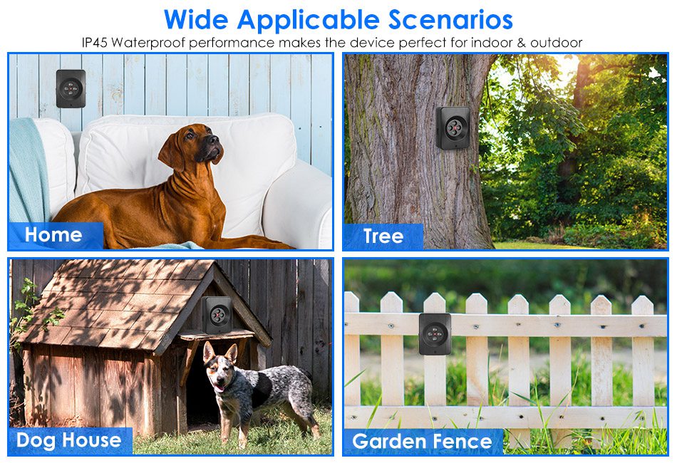 - IP45 Waterproof:With premium IP45 waterproof performance,this bark controller can be mounted at garden fence,home,dog house,tree etc..