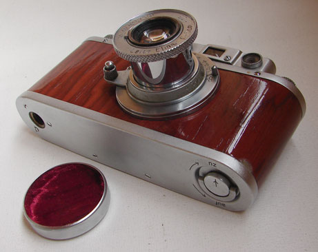 | Olympia 1936 edition, chrome plated, wood veneer finished with built-in rangefinder |