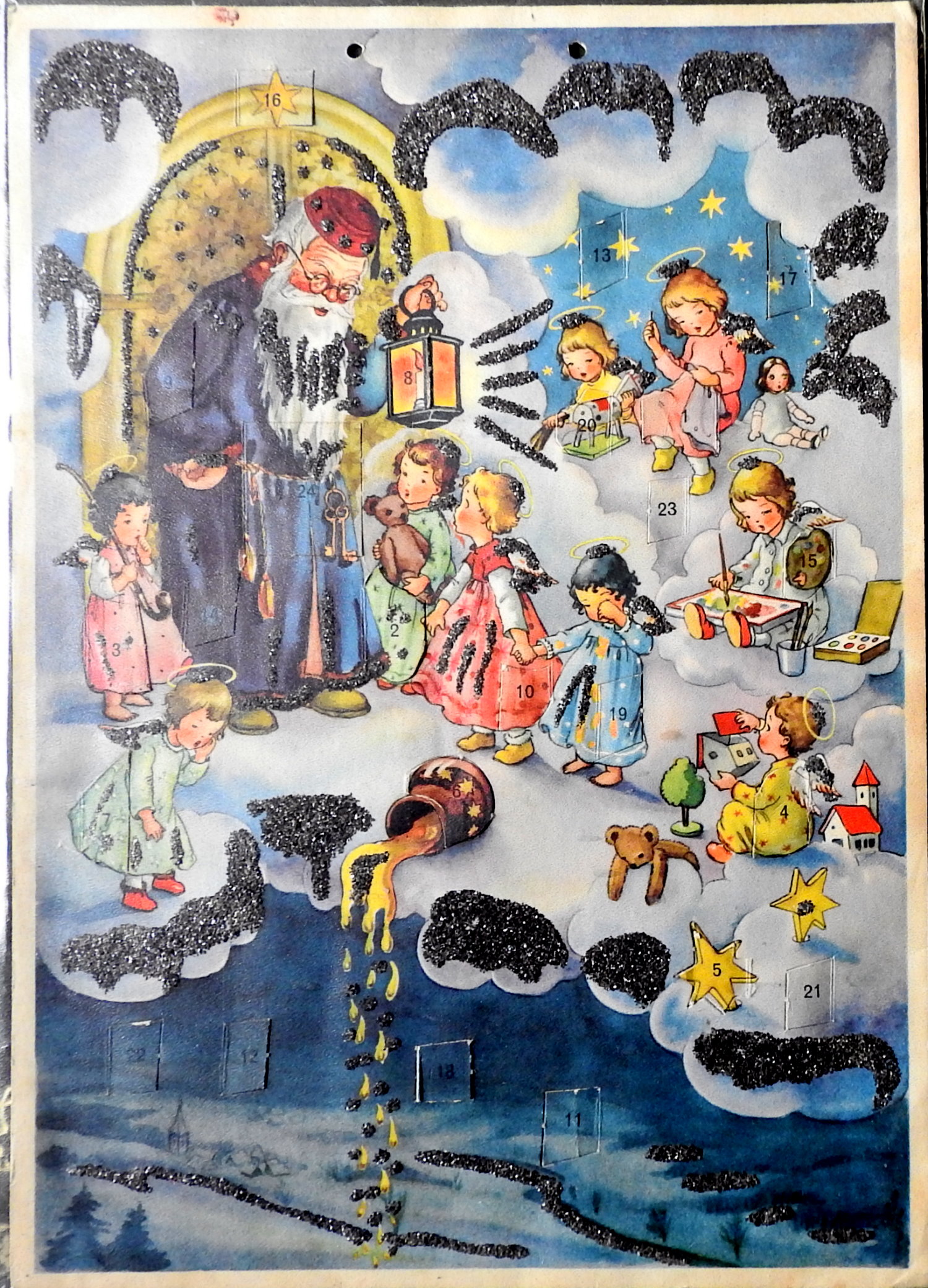 sehr schönes weihnachtliches Motiv mit viel Glitzer, Hersteller nicht bekannt, wohl Anfang 50er, DIN A4, Türchen waren geöffnet - 2 Türchen rückseitig gestützt - sonst einwandfrei erhalten - siehe Fotos, sehr dekorativ