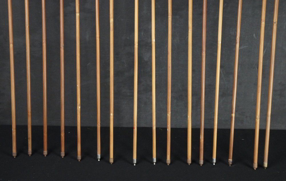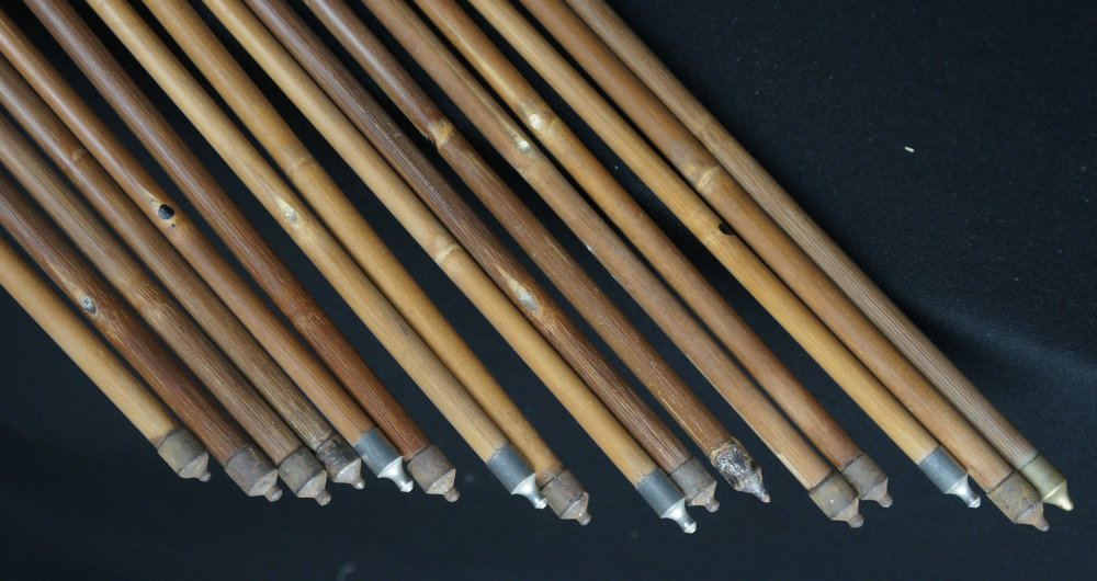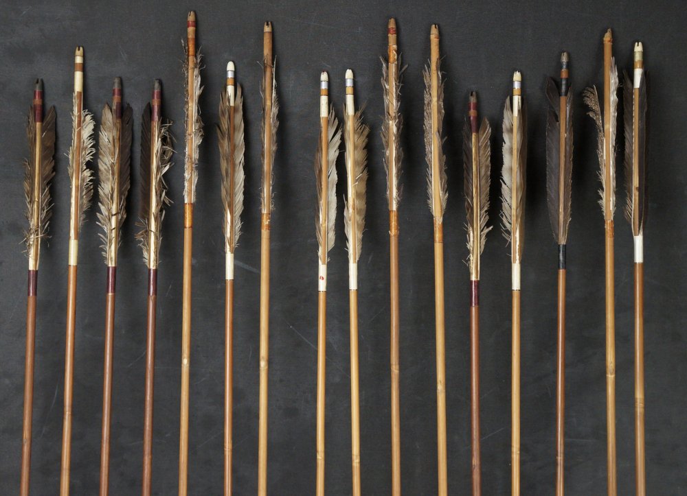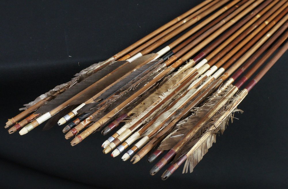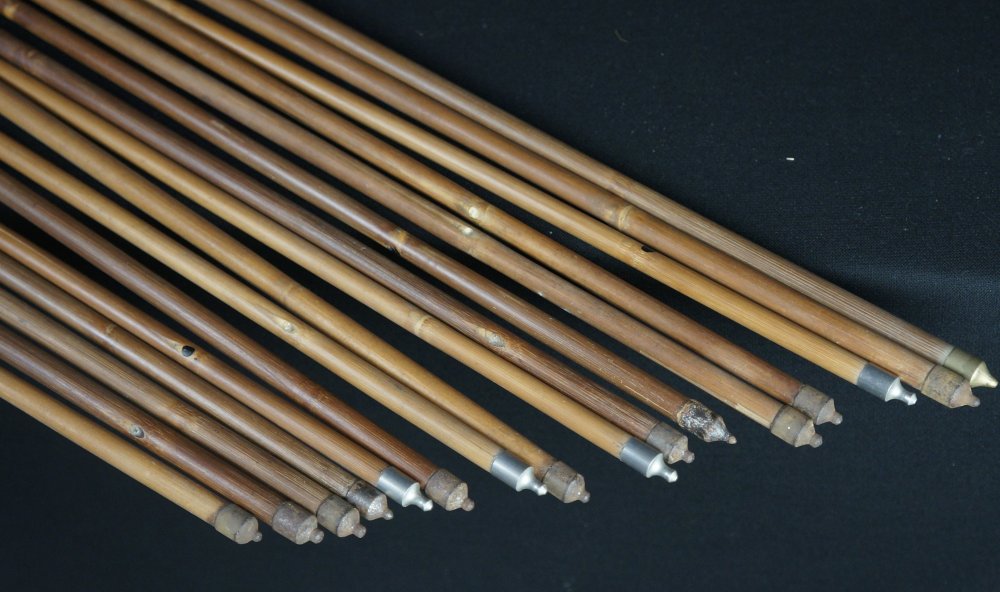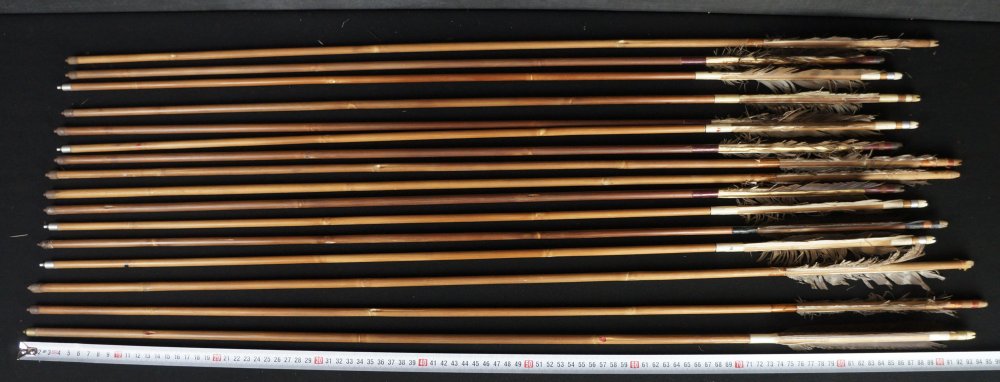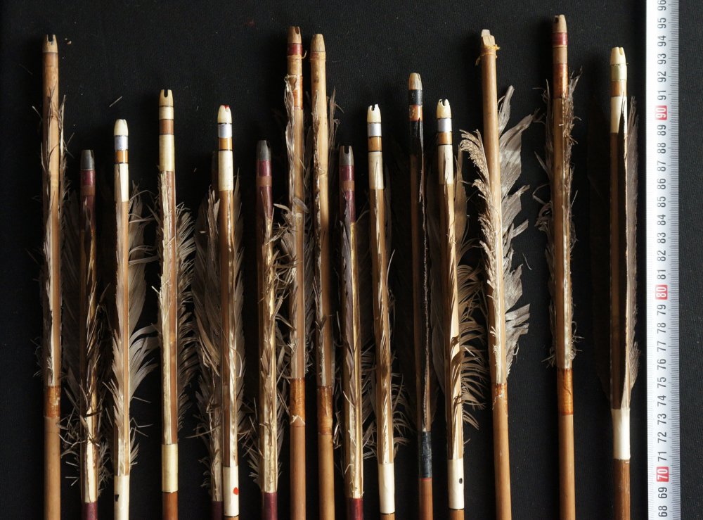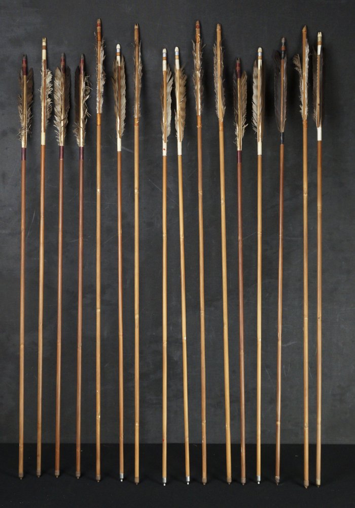Japanese Ya arrow set of 15, hand made from bamboo shaft and feathers. Poor conditions, extensive wear from time and usage, no broken bamboo shaft,missing feathers or in poor conditions, ideal for restoration and reuse or as historical arrows. To be used as antique/vintage item, fine Japanese craft.