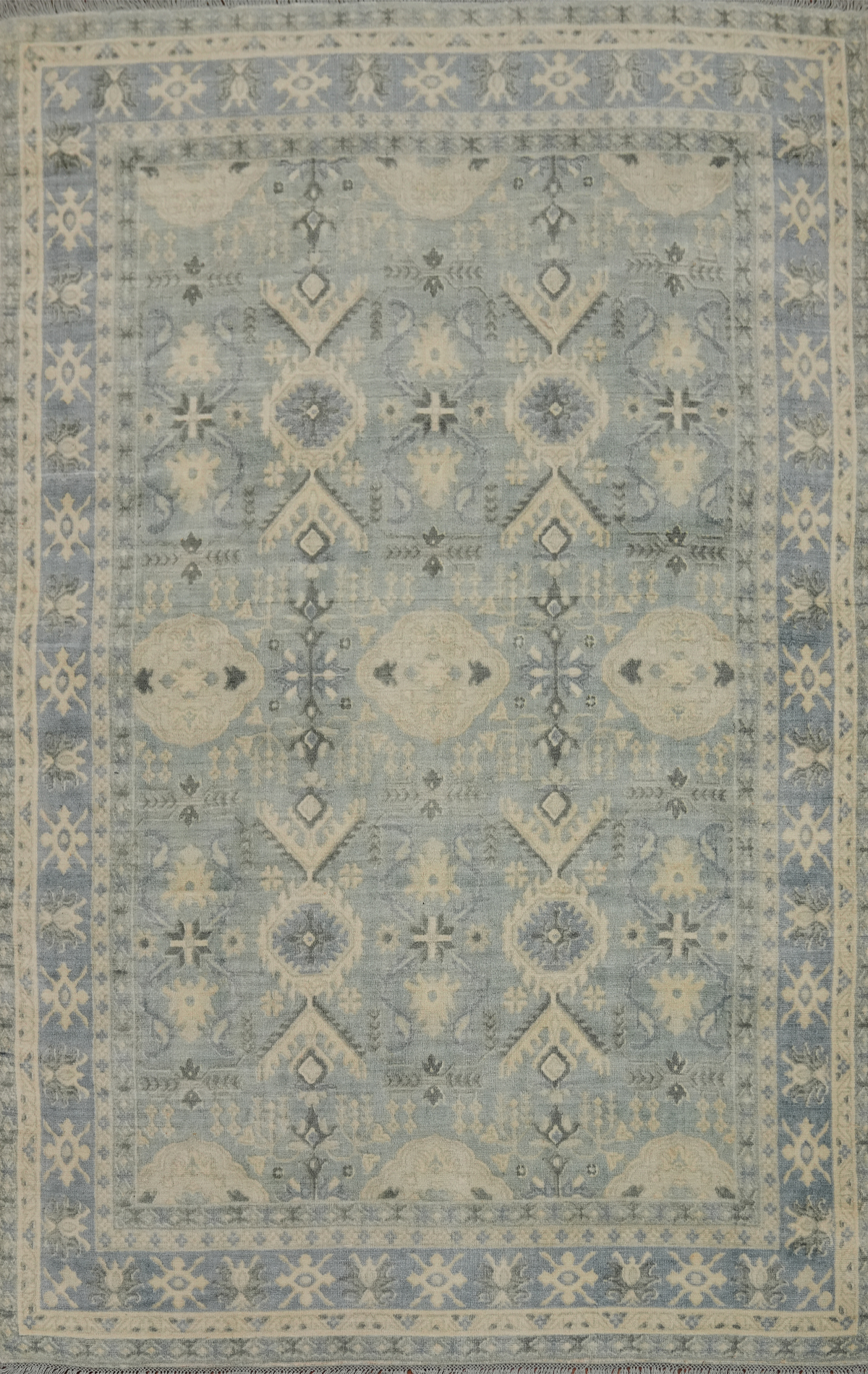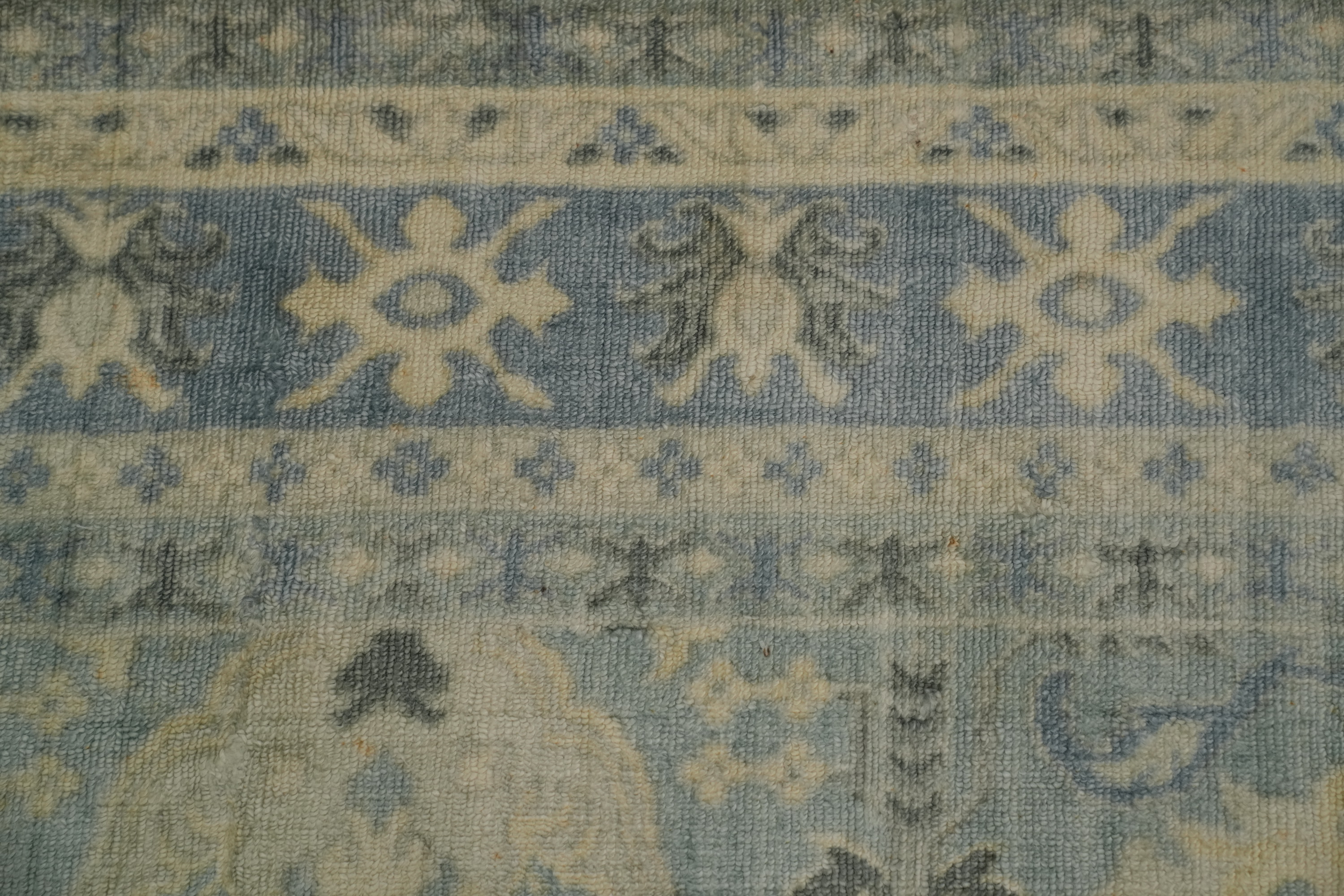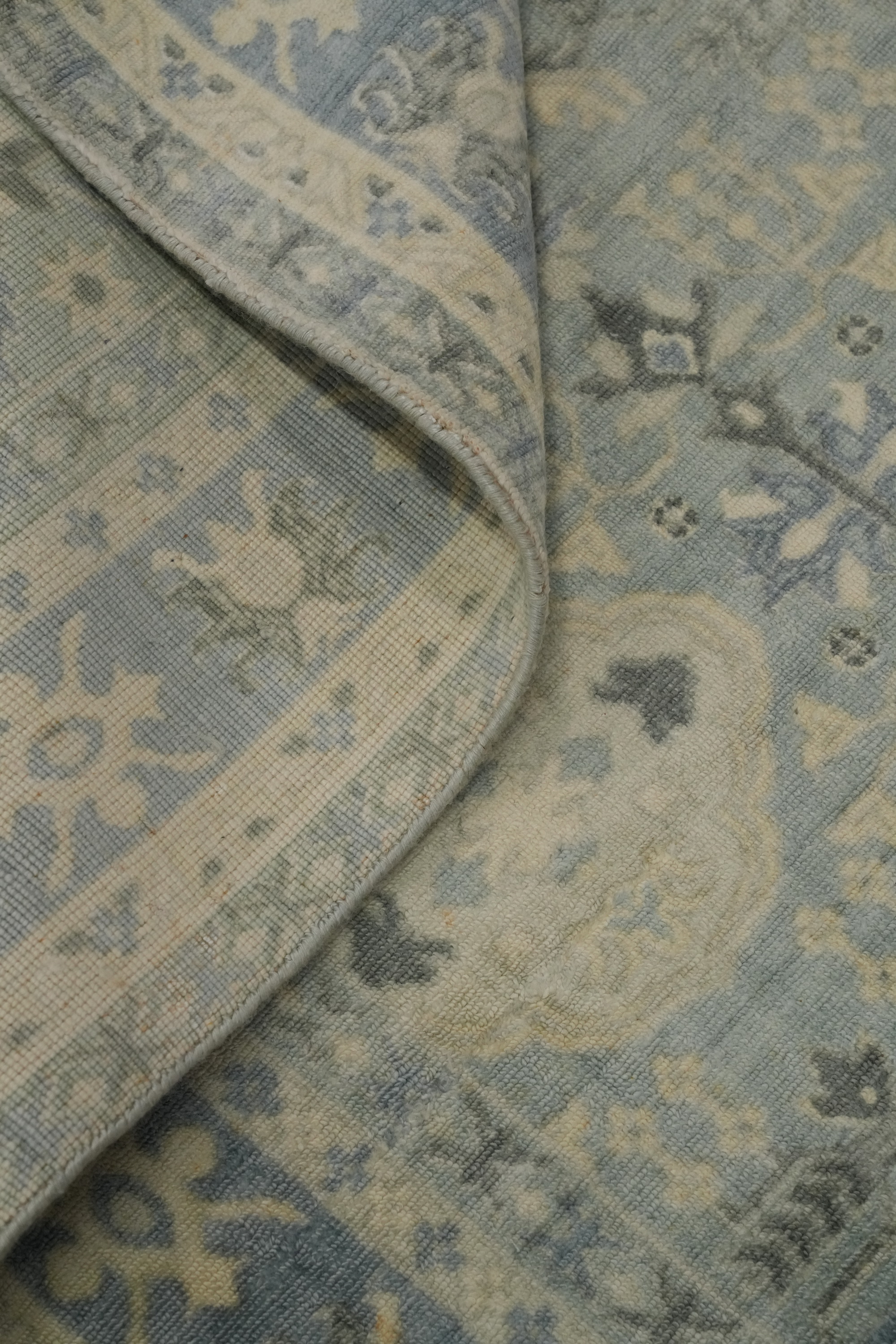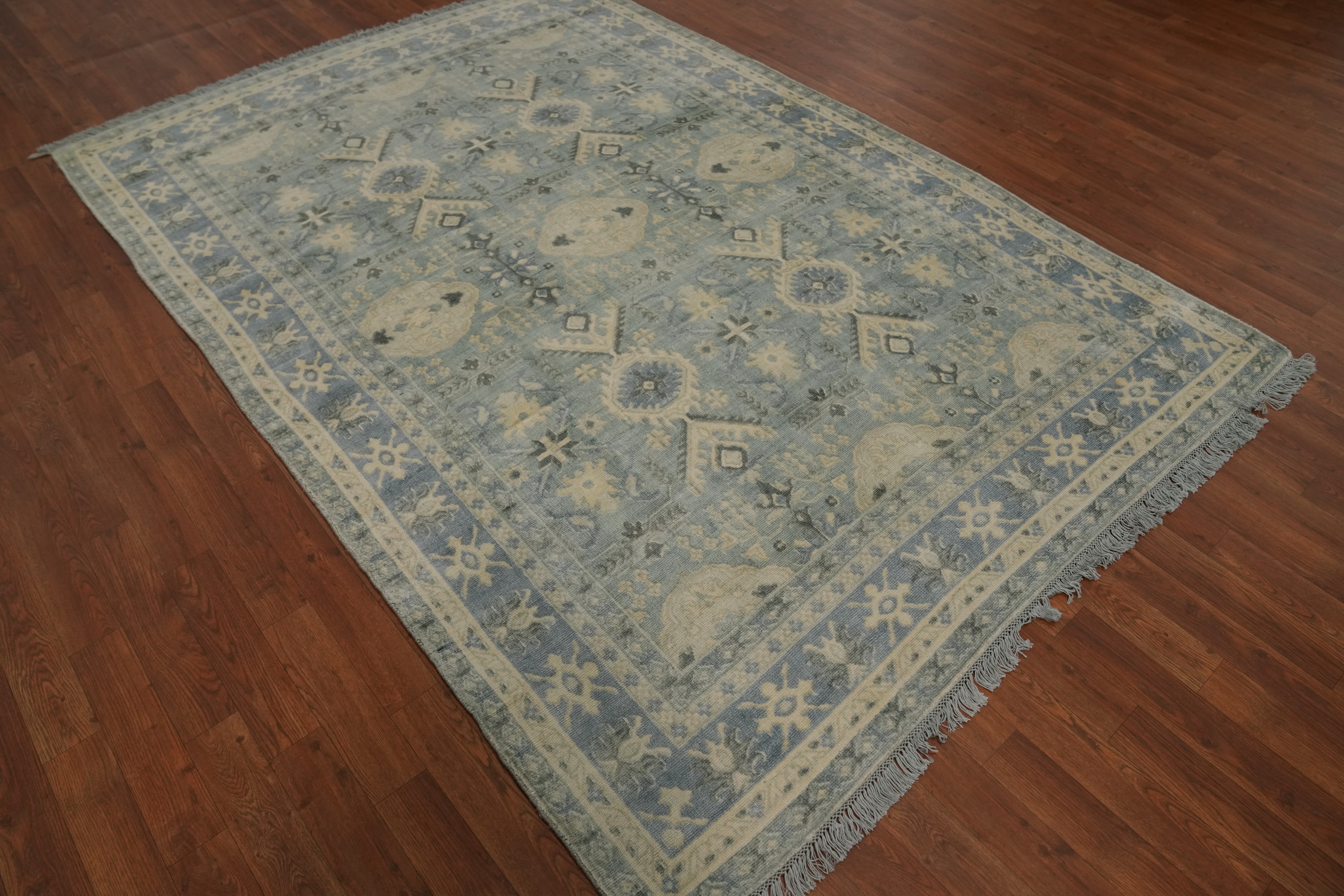 Handmade Light Blue Geometric Oushak Area Rug 6x8 Ft Transitional Silk Carpet