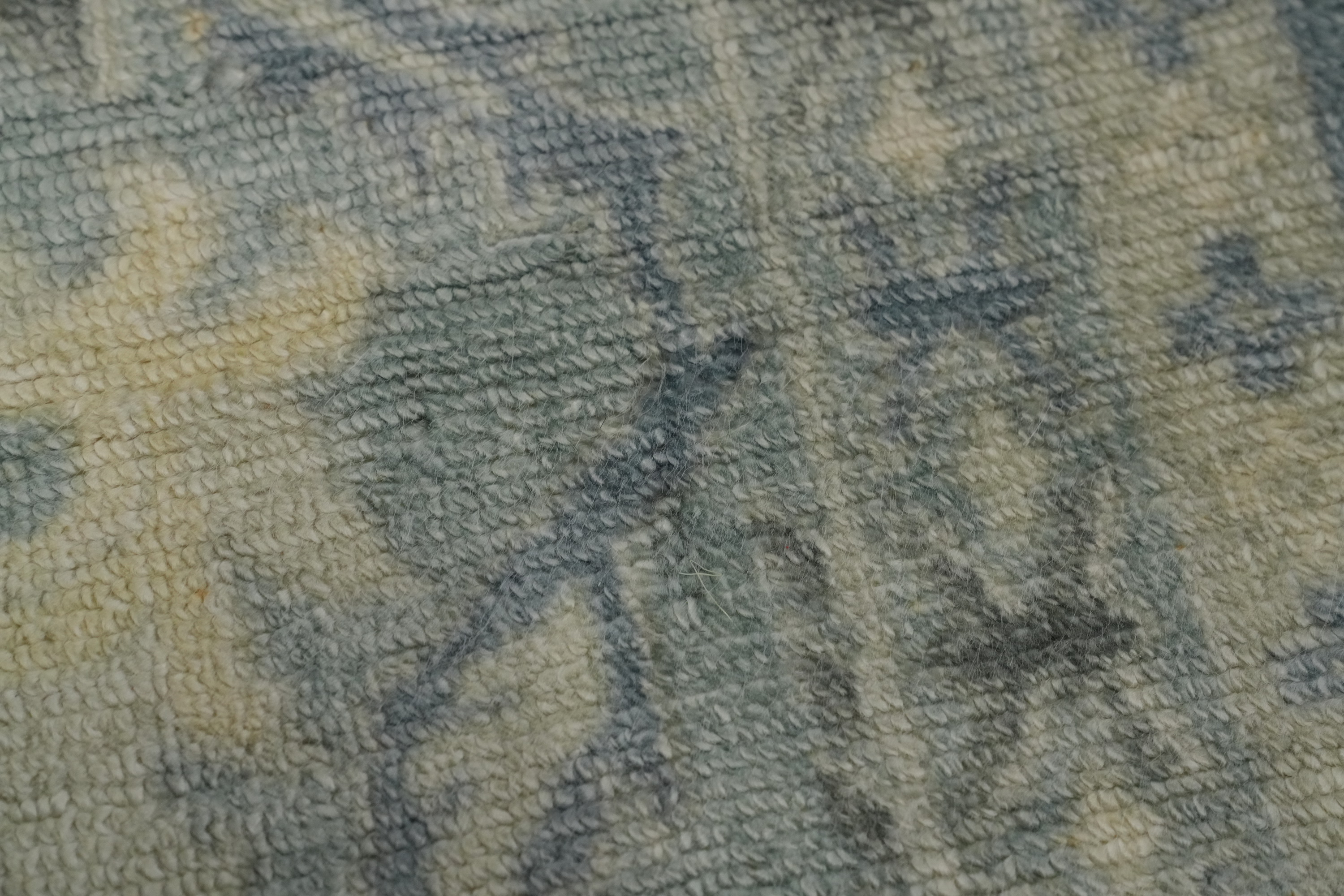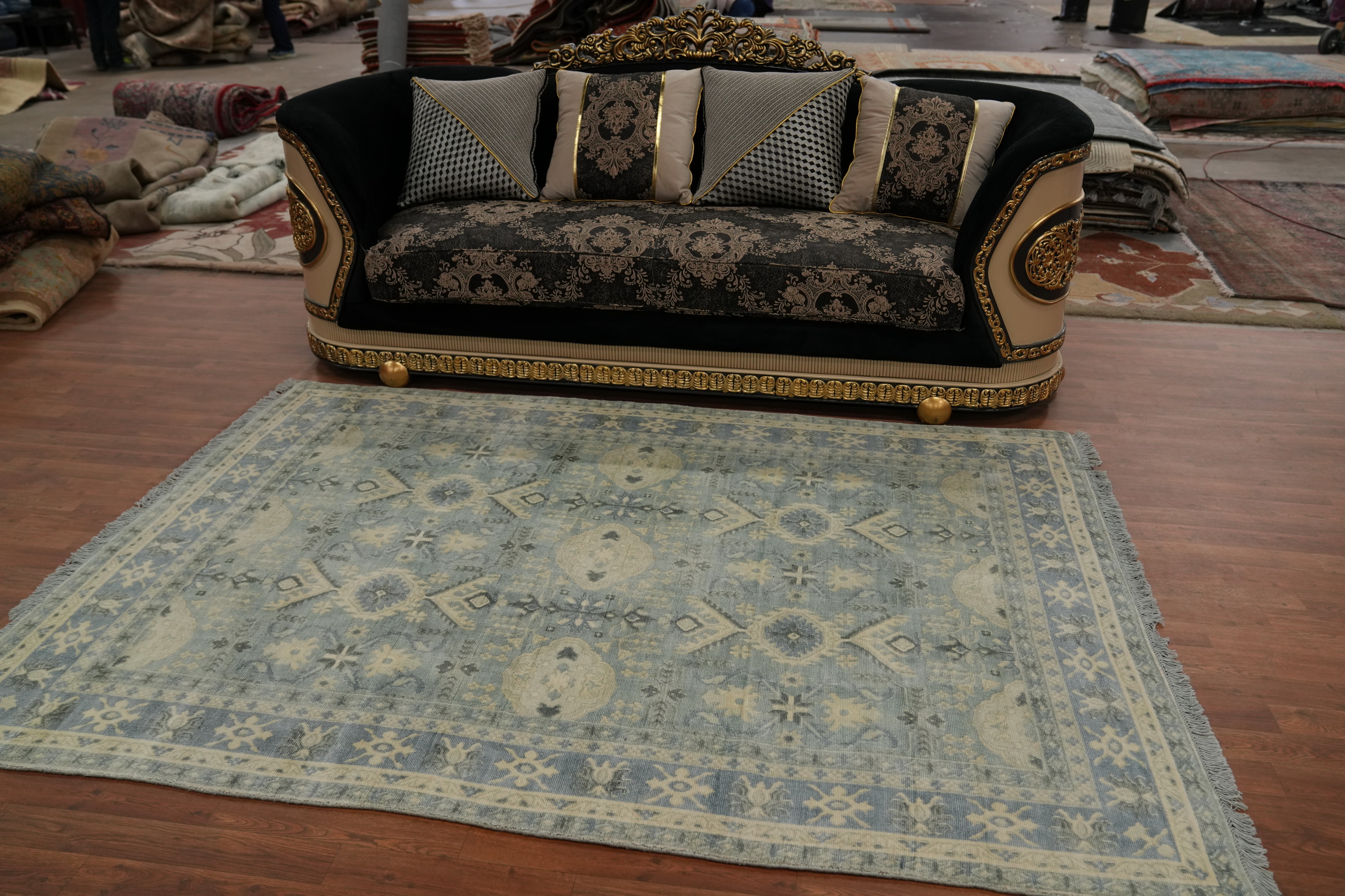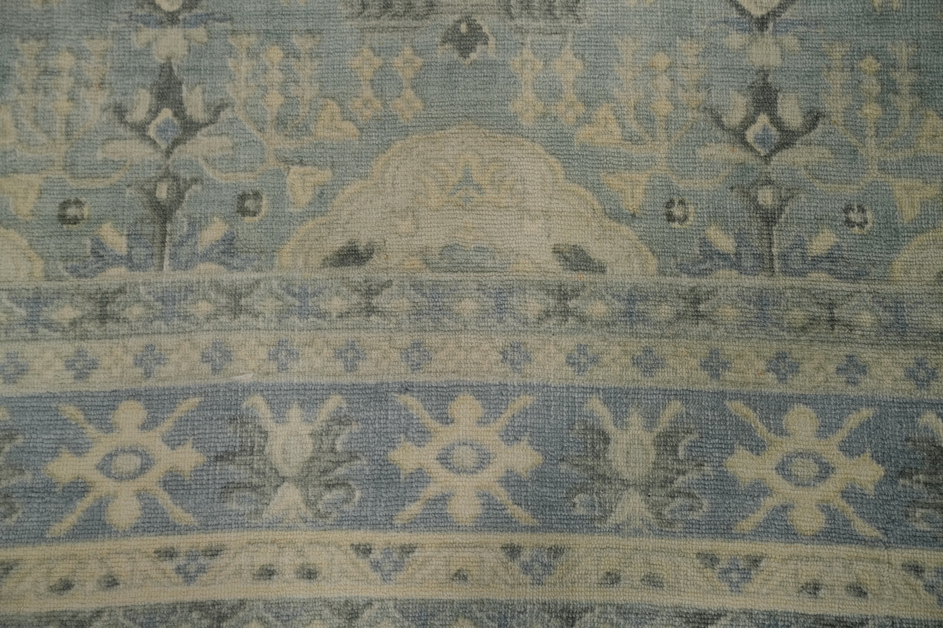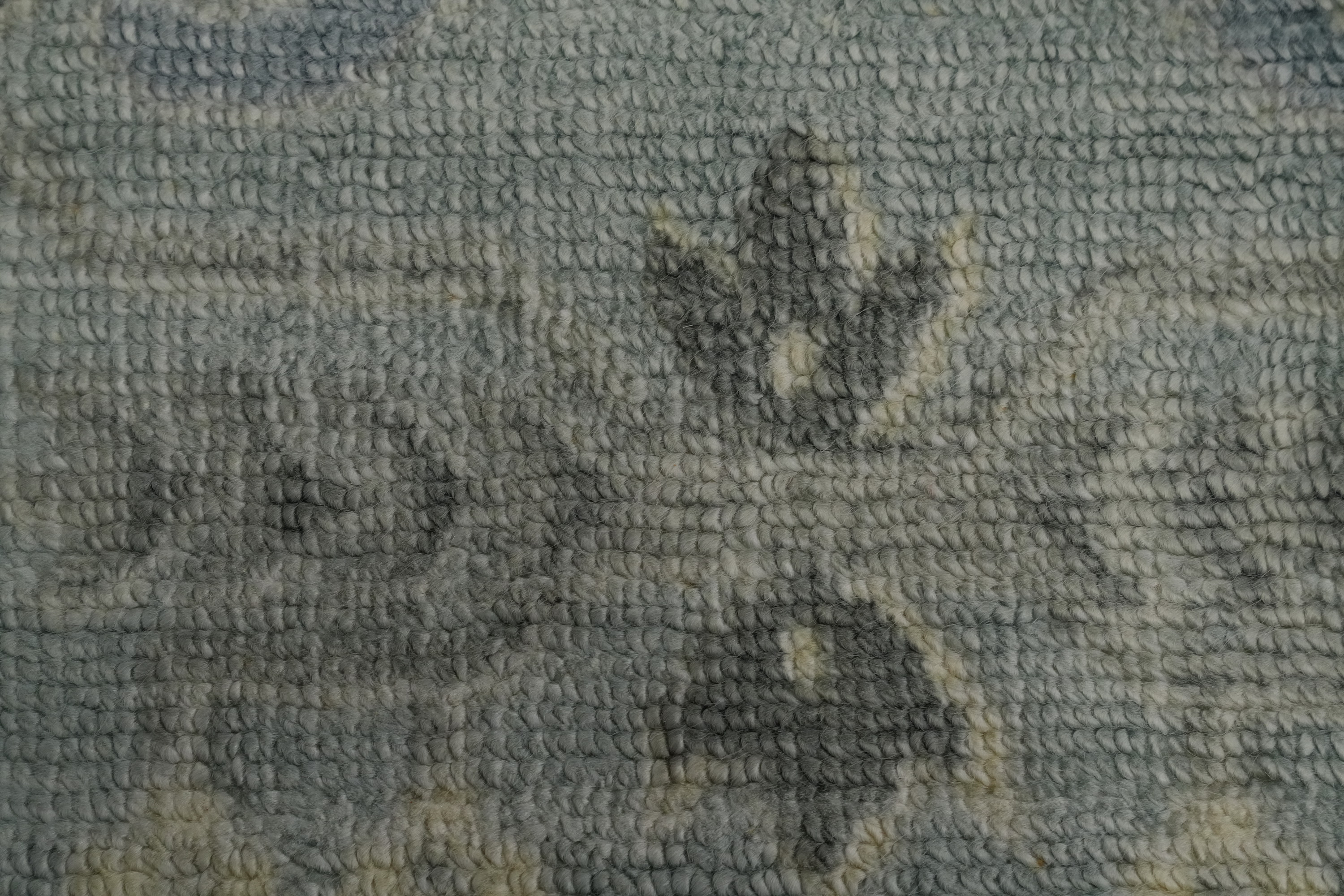 Handmade Light Blue Geometric Oushak Area Rug 6x8 Ft Transitional Silk Carpet