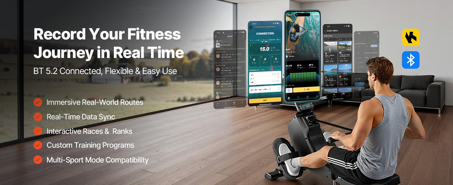 - Bluetooth 5.0 & Live Progress Tracking: This magnetic rowing machine connects seamlessly with Kinomap through Bluetooth 5.2, offering an engaging virtual training experience. It allows you to monitor and save your workout data daily, helping you track improvements and maintain motivation during every session.