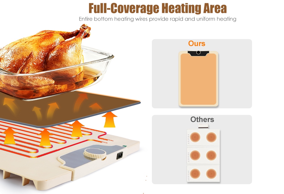 - 8S Full Surface Heating:Adopts graphene heating wires that cover the entire bottom surface,our food warming mat ensures rapid and even heat distribution in about 8S,effectively keeping your meals warm and delicious. Ideal for a variety of occasions such as family gatherings,festive celebrations,social dining events,parties,and buffets.