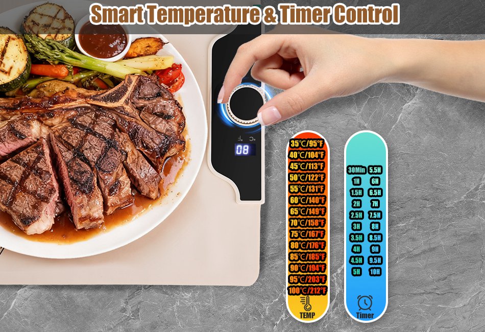 - 10Hours Smart Timer Settings:Built-in 0-10hours smart timer settings enables you to leave this electric warming tray on without constant supervision,guarantees both safety and energy-efficiency. 6.56FT length detachable power cord is provided for enhance convenience.