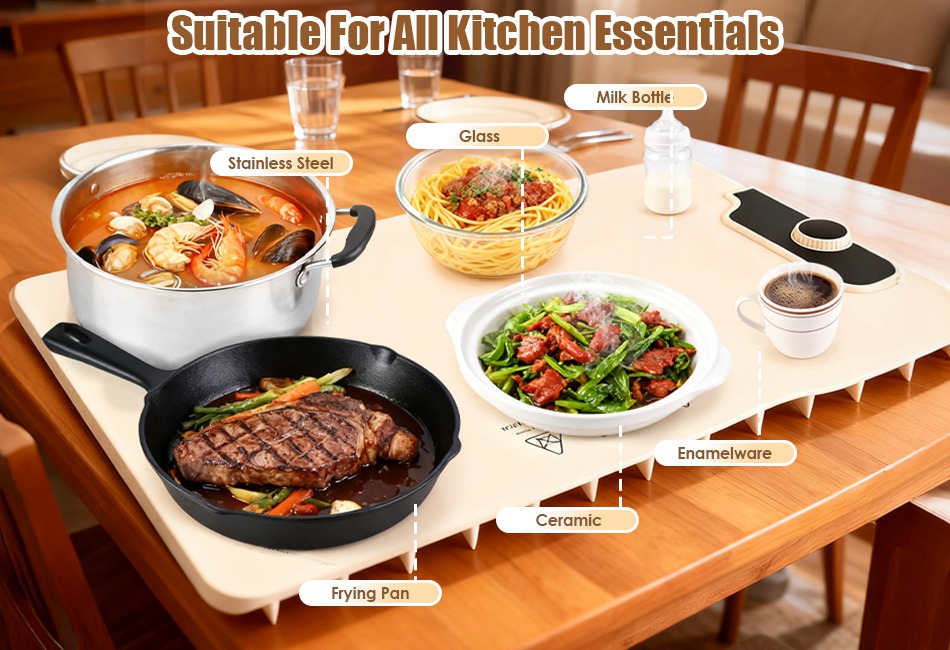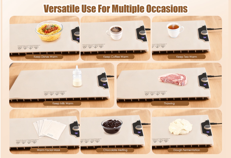 - Widely Compatible With Various Occasions:Raised 10mm feet protect the table surface from overheating. This silicone food warming mat is suitable for a various types of tableware,such as stainless steel,ceramic,milk bottle,enamelware,glass,frying pan etc.. Also widely use in warming up facial masks,thawing iced meat,fermenting dough and keeping the dinner warm for who comes home late.