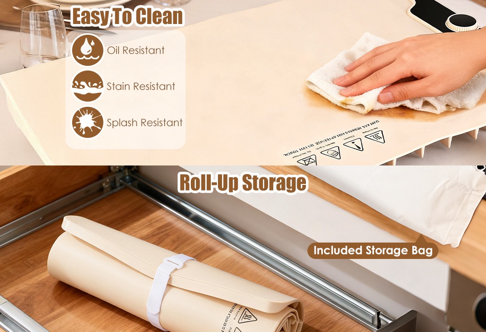 - Oil & Stain-Resistant Silicone Material:Crafted from silicone material,soft-touch,resistant to splashes,oil,stains,making cleanup as simple as wiping with a damp cloth or sponge after each use. Also effortlessly roll it up,pack it into included storage bag for compact storage or hassle-free transportation.