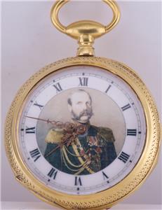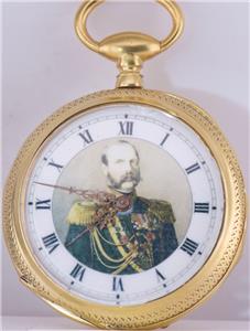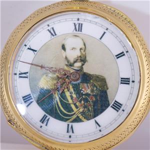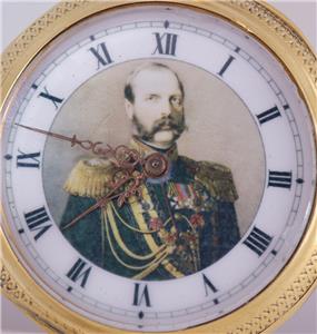 La montre a un cadran en émail fin représentant un portrait de Tsar Alexander II, avec des mains fantaisistes d'or originales.