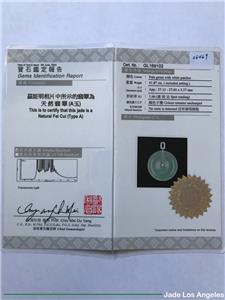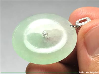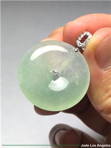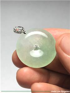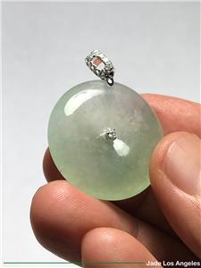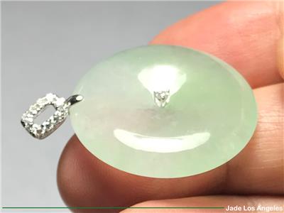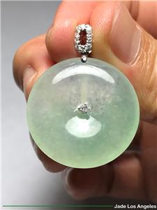Up for sale is a gorgeous Hong Kong certified "Donut Circle" old type icy jadeite jade pendant with solid 18K white gold diamond bail (Round Diamond: 11 / White / 0.16 ct.) (Total Weight: 41.87 ct. = 8.374 grams) and a certificate (#GL169102) issued by Hong Kong Gems Laboratory or 100% lifetime money back guarantee. There is a total number of 11 diamonds on the pendant. Please be sure to know the exact dimensions, the weight and read the certificate. If you have any questions, please do not hesitate to contact me. Thank you very much.