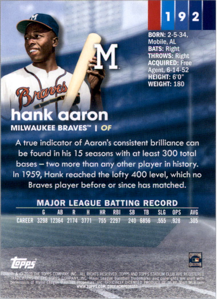 2020 Stadium Club Black Foil #192 Hank Aaron - BB