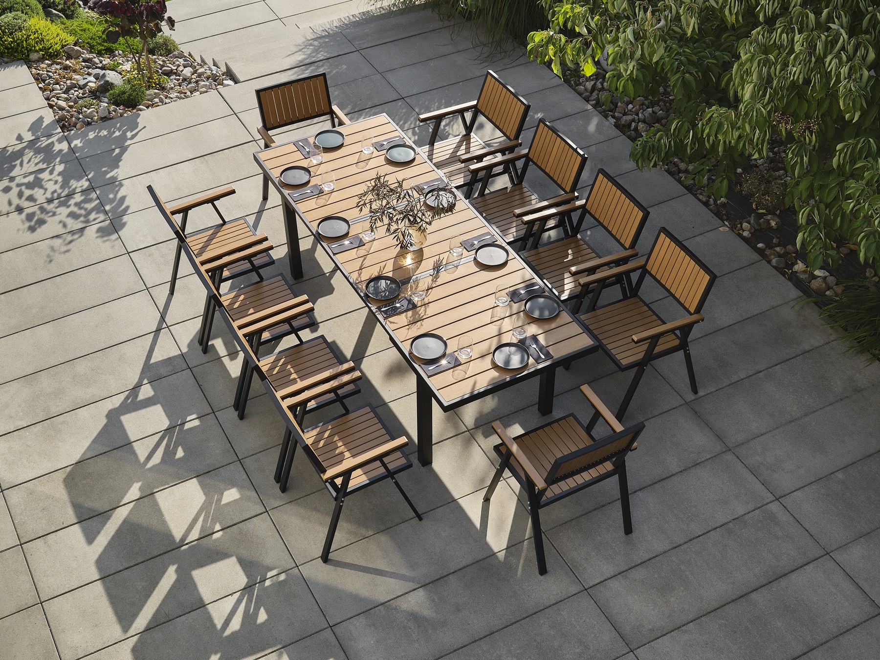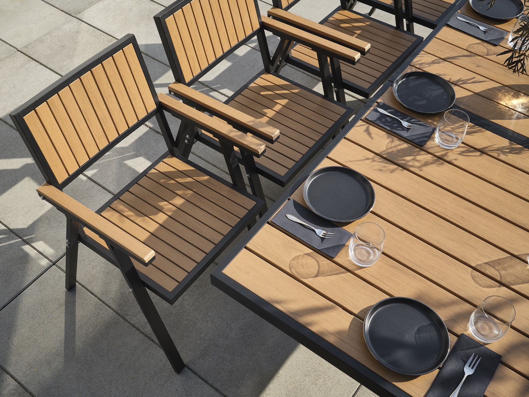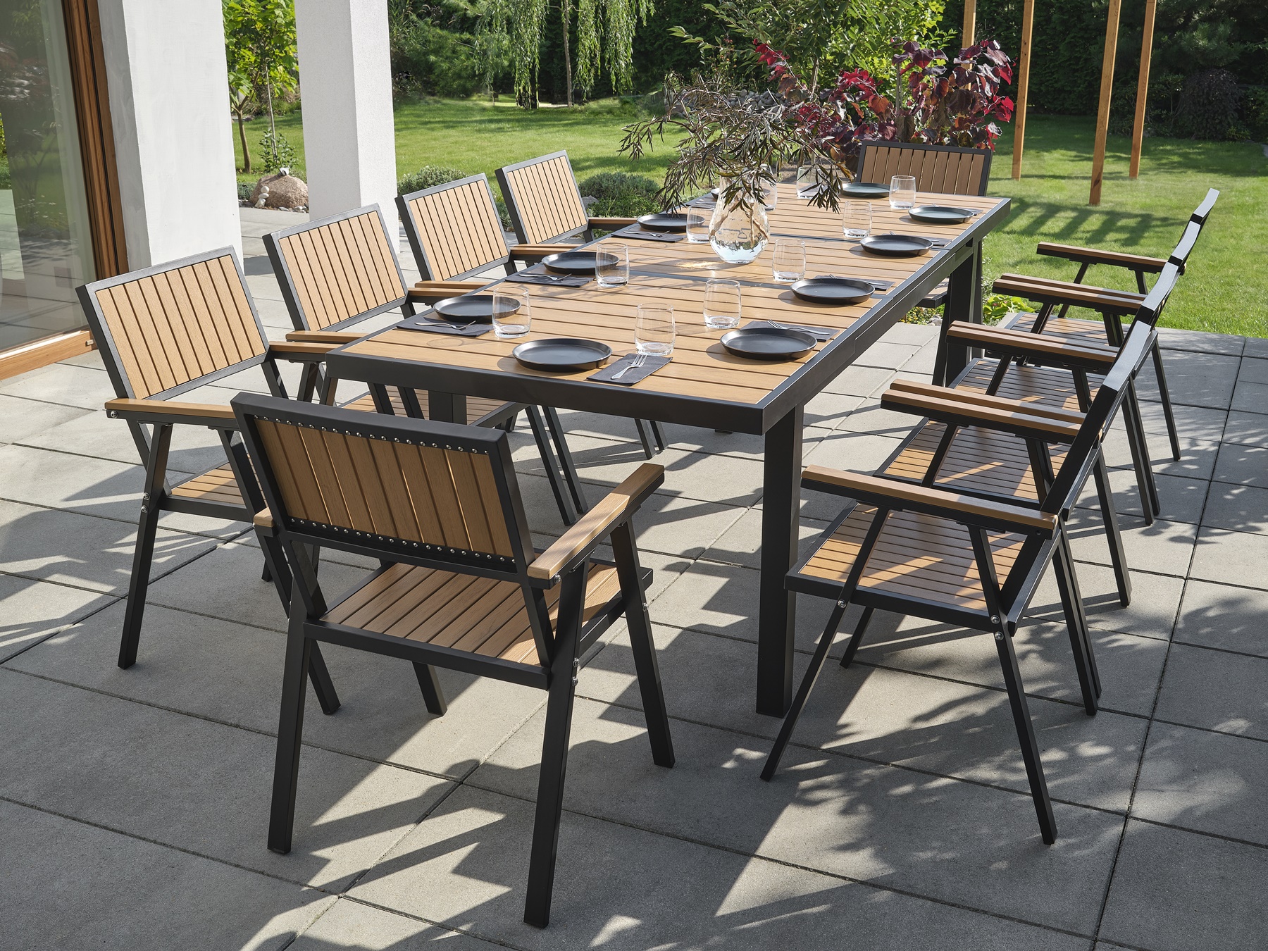 Ein modernes Gartenstuhl aus WPC-Polywood-Komposit ist eine Kombination aus elegantem Design, Komfort und Witterungsbeständigkeit. Er eignet sich hervorragend für die Terrasse, den Balkon, den Garten oder die Veranda und schafft einen stilvollen Raum zum Entspannen und für Begegnungen im Freien. Universelles Design Die minimalistische Form und die elegante braun und schwarz Farbe lassen den Stuhl perfekt mit jedem Gartentisch harmonieren, besonders mit Modellen mit einer Tischplatte aus WPC-Verbundmaterial. Ideal für moderne Terrassen- oder Patio-Gestaltungen.