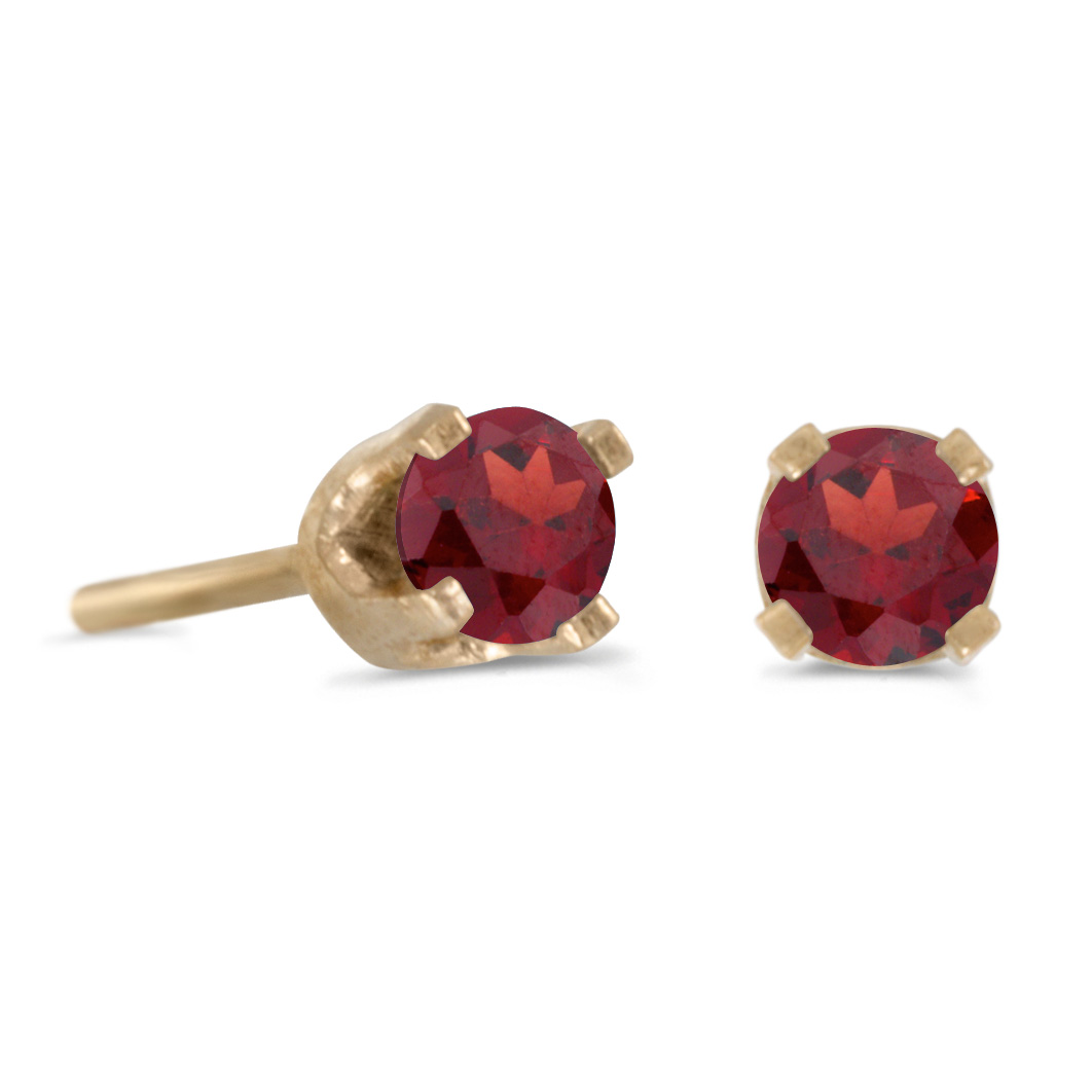 These 14k petite yellow gold round garnet stud earrings feature 3 mm genuine natural garnets with a 0.24 ct total weight.
