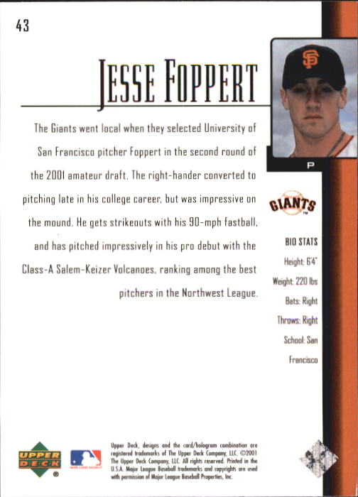 2001 Upper Deck Prospect Premieres #43 Jesse Foppert XRC - BB