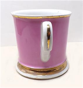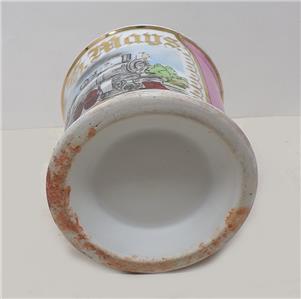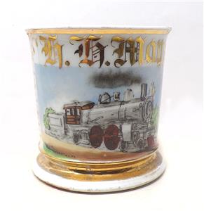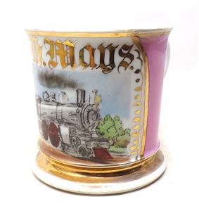 An antique occupational shaving mug depicting a 19th century 4-4-2 steam locomotive and tender. The mugs original owner, stated in gilt, was H. H. Mays. It is in fine condition, with only very minor signs of age and use.