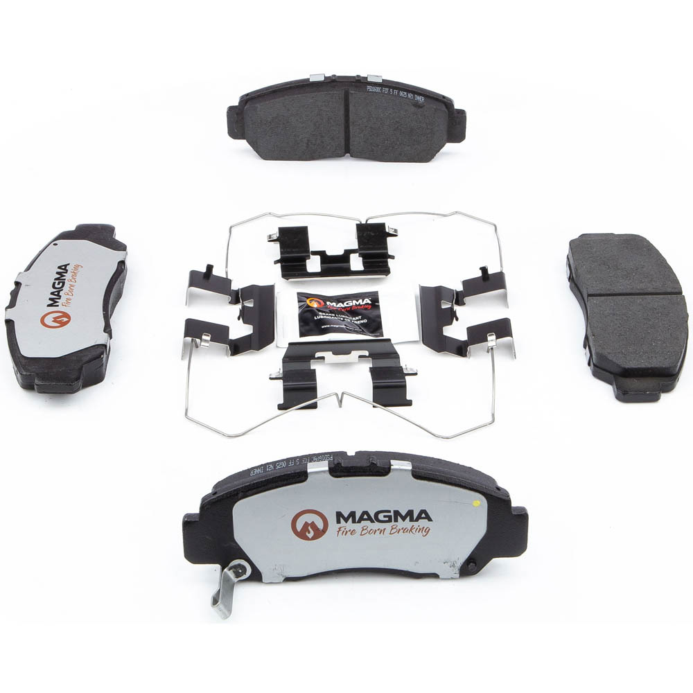 WHY MAGMA? - Today's harsh stop and go environment can create very high heat levels in your braking system which can reduce the vehicle's ability to stop. Extreme high temperatures can be reached in many braking situations such as - Stop and Go Traffic, Mountain Driving, Hauling or Towing, Emergency Stops, Spirited Driving and Long, Sustained Braking. At MAGMA Brakes, we use FIRE to fight FIRE. Our brake system components are made using advanced, state of the art techniques and treatments that ensure our brakes will stand up to the heat.MAGMA Pro-Series brake pads feature...1. Scorched, copper free friction formulations for overall ltimate braking performance2. Vulcanized OE style rubber core shims for unsurpassed noise suppression3. Heat-tempered upgraded dual-coated stainless steel hardware kits to restore the brake pad to caliper interface to ""like new"" condition (where applicable)4. Heat expansion OE style slots and chamfers to dissipate noise and stand up to the heat5. High-heat resistant brake lubricant included for lubricating critical points during pad installation