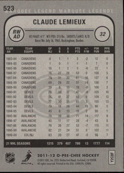 2011-12 O-Pee-Chee #523 Claude Lemieux L - HKY