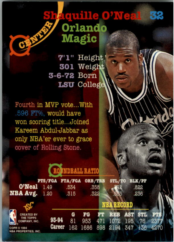 1994-95 Stadium Club #32 Shaquille O'Neal - BSK
