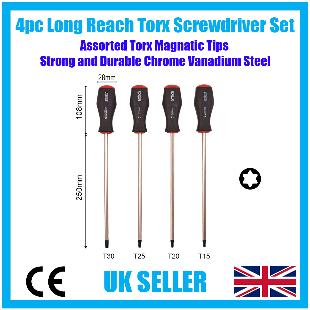 4pc 250mm Long Reach Heavy Duty Torx Screwdriver Magnetic Tips T15 T20 T25 T30