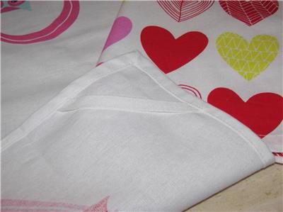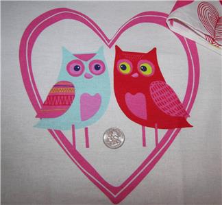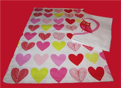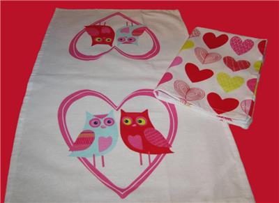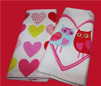 This new cotton kitchen towel set has two coordinating designs. One is all hearts, and other has the image of two owls in a large heart. Colors are white, pink, aqua, and yellow. The towels are new.