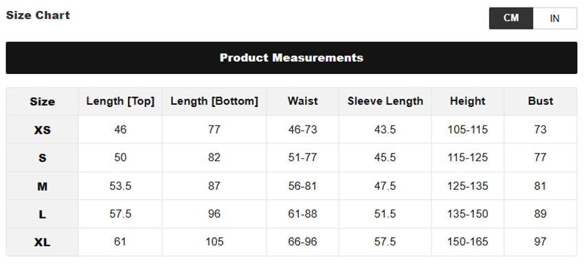 Size Height (Recommended) Bust Waist Top Length Bottom Length Sleeve XS 105 - 115 cm 73 cm 46-73 cm 46 cm 77 cm 43.5 cm S 115 - 125 cm 77 cm 51-77 cm 50 cm 82 cm 45.5 cm M 125 - 135 cm 81 cm 56-81 cm 53.5 cm 87 cm 47.5 cm L 135 - 150 cm 89 cm 61-88 cm 57.5 cm 96 cm 51.5 cm XL 150 - 165 cm 97 cm 66-96 cm 61 cm 105 cm 57.5 cm