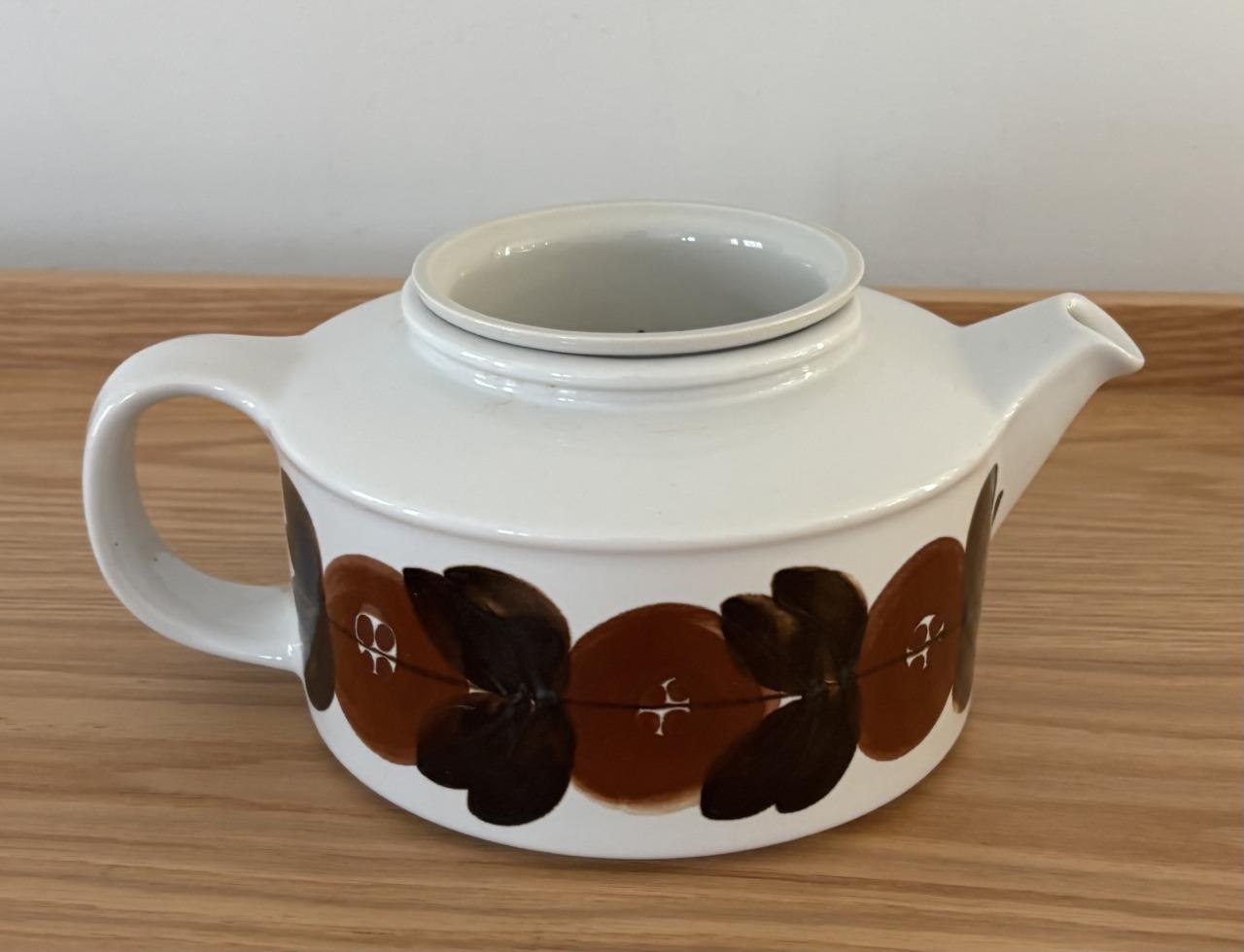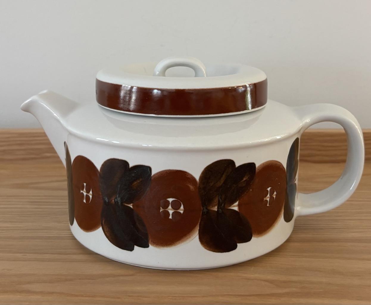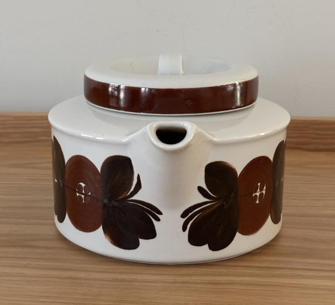 Offering a vintage mid-century modern stoneware large 5 cup lidded tea pot + infuser made by Arabia of Finland in excellent, clean condition in the iconic hand-painted Rosmarin pattern (the brown version of the blue Anemone pattern) designed by Ulla Procopé. Fully marked on the bottom. Made in Finland. No chips, cracks, crazing or repairs.