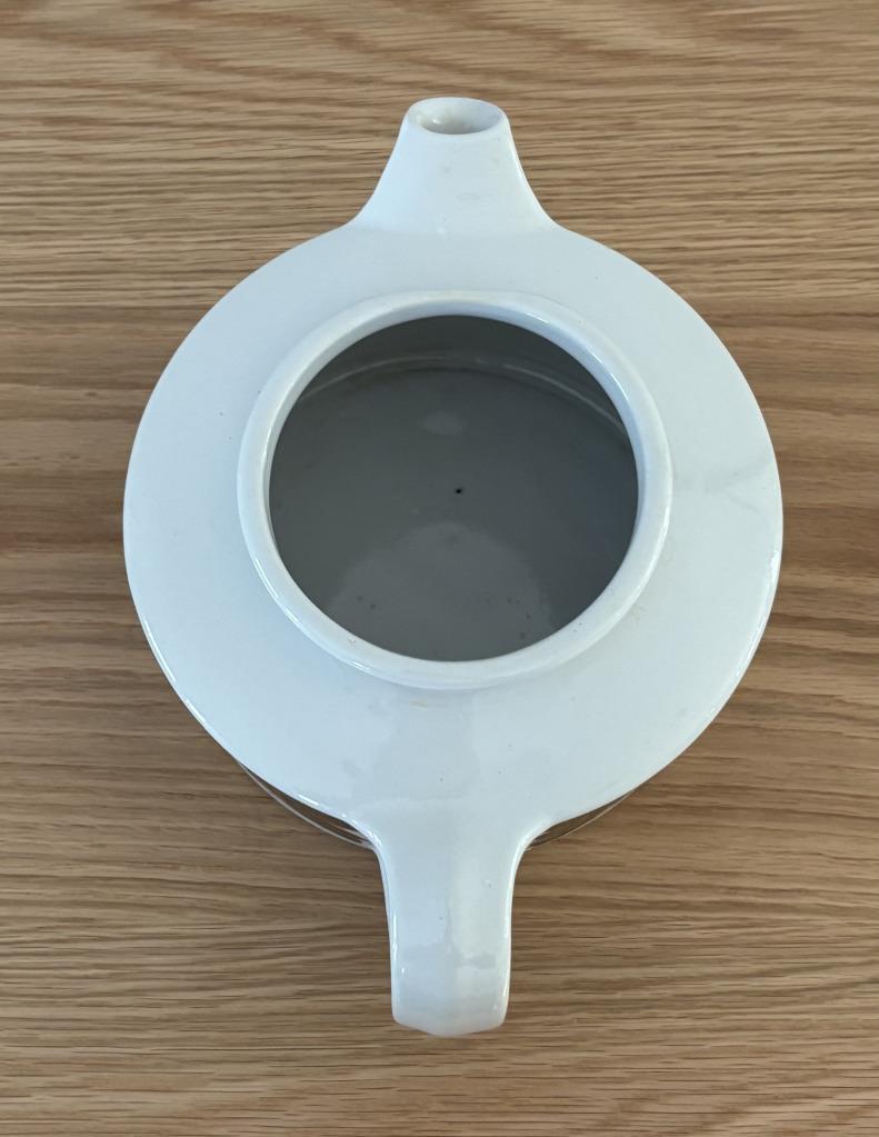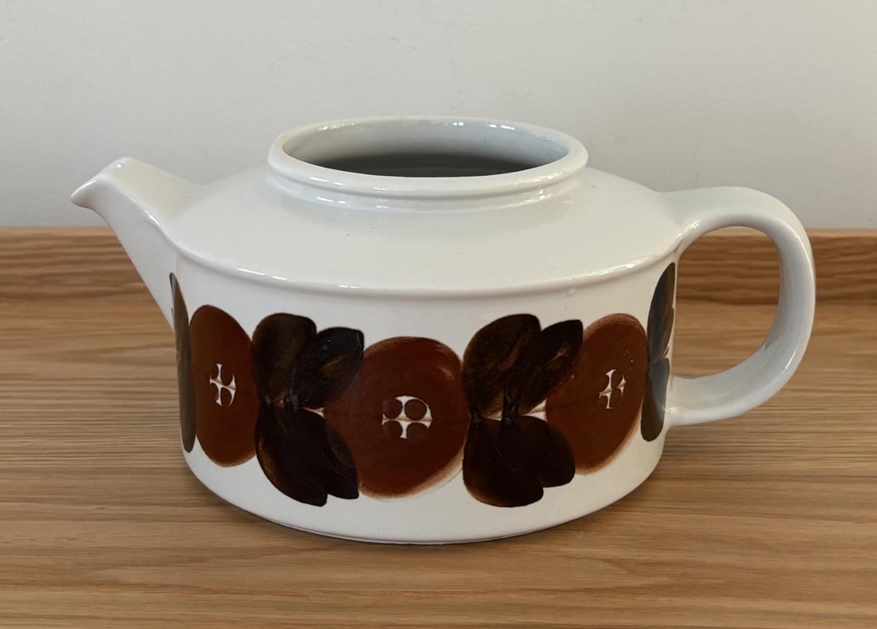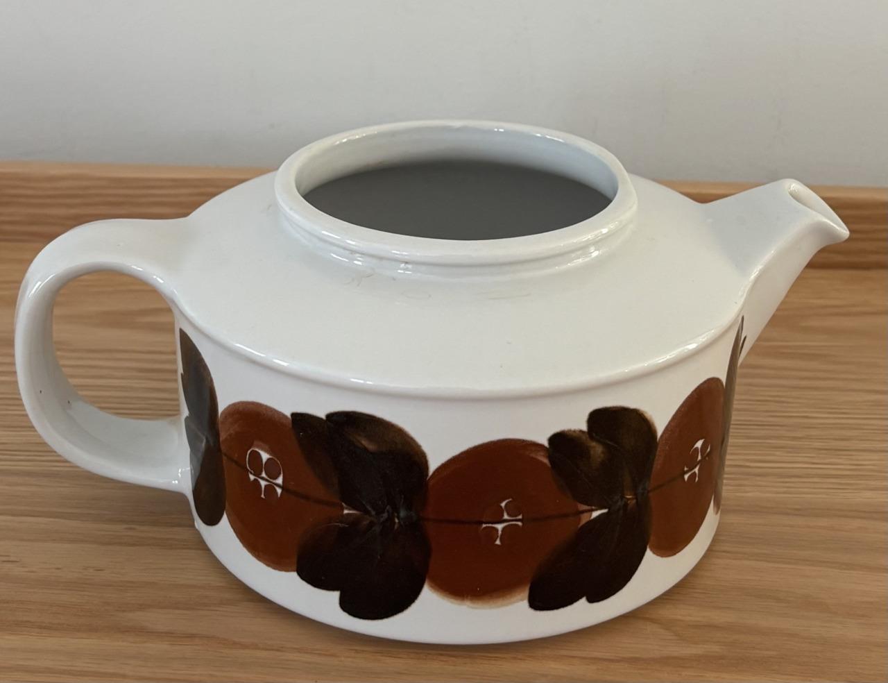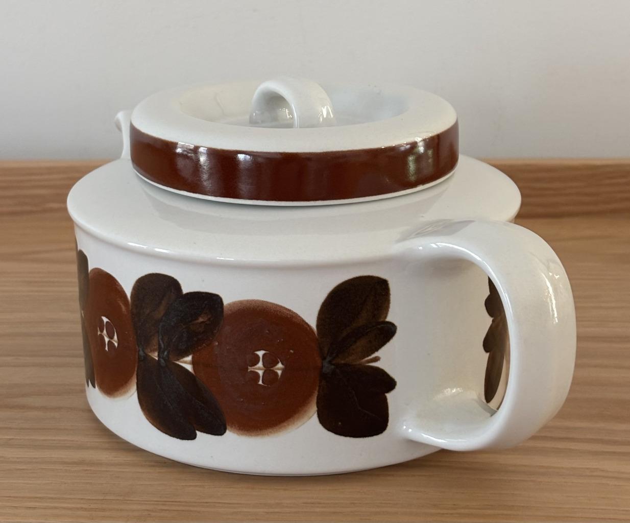Offering a vintage mid-century modern stoneware large 5 cup lidded tea pot + infuser made by Arabia of Finland in excellent, clean condition in the iconic hand-painted Rosmarin pattern (the brown version of the blue Anemone pattern) designed by Ulla Procopé. Fully marked on the bottom. Made in Finland. No chips, cracks, crazing or repairs.