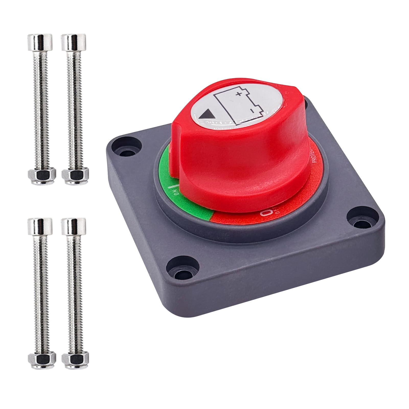 Ampper panel mounted battery switch, battery power master switch disconnect isolator for car, vehicle, Rv, boat and more.Specifications:1, ABS plastic housing, durable made for safety use.2, NO rear and side pads / covers for surface mount application.3, On/Off 2 positions.4, Copper terminal studs with nuts and washers.5, 4 mounting screw holes.6, 275 A continuous at DC 12V, 455 A Intermittent at DC 12V, 1250 A momentary at DC 12V.7, Used for DC 12 - 48V systems panel mounted to isolate and secure the electrical system.8, Can stand alone or be locked together with other switch.9, Eliminate any power draw from the battery when vehicle or boat is not in use.10, Disconnects the battery safely.11, Universal used for Car, Vehicle, RV, Boat and More.12, Used as electrical equipment's switch.13, Size: 2.68" x 2.68" x 2.75".Complete kits includes:1 x battery switch.4 sets of mounting bolts.
