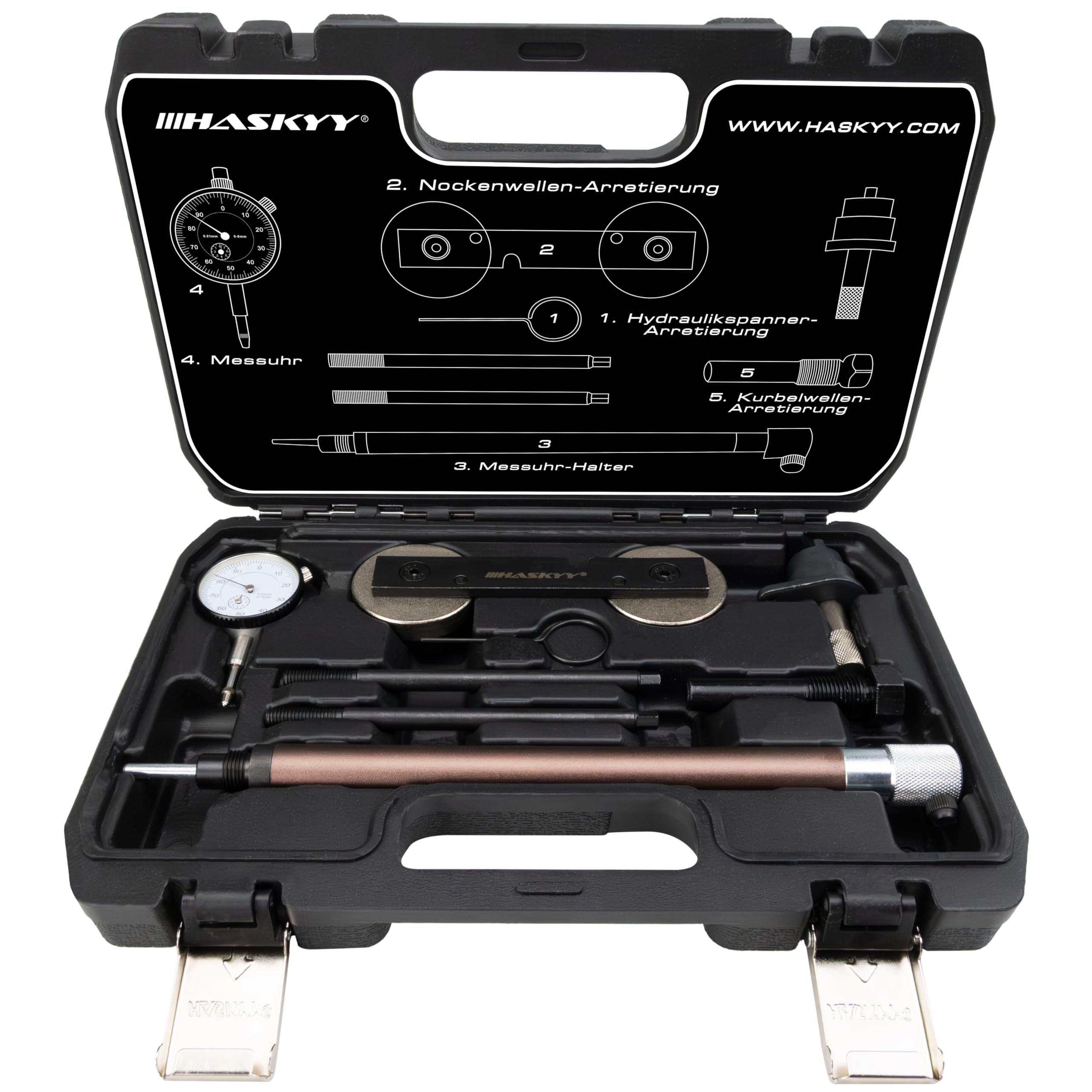 Blocage d'arbre à cames (OEM T10171) pour une installation et un retrait sûrs de l'arbre à cames / Blocage de vilebrequin (OEM T10340) pour une fixation précise du vilebrequin - Support de comparateur (OEM T10170) d'une longueur totale de 274 mm avec filetage extérieur M14 x 1,25 mm pour le réglage du point mort haut - Blocage du tendeur hydraulique (OEM T40011) avec tige de serrage de 8 mm pour une fixation sûre du tendeur hydraulique - 2x goupille d'arrêt du vilebrequin (OEM T10341) d'une longueur de 135 mm pour une fixation sûre du vilebrequin / jauge de précision pour trouver le PMH du piston avec une résolution de 0,01 mm et une plage de mesure de 0-8 mm - convient pour les lettres d'identification du moteur AXU, BAG, BKG, BLF, BLN, BLP, BMY, BTS, BLG, BWK, CAVA, CAVB, CAVC, CAVD, CAVF, CAXA, CAXC, CDGA, CBZA, CBZB, CBZC