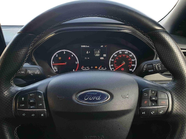 ..4'' TFT coloured cluster screen, Bluetooth system, Digital clock, Easy fuel capless refuelling system, Eco mode, Ford pass connect, Ford SYNC 3 nav system with DAB radio, 8'' colour touch screen, voice control, app link, Apple car play/Android auto and 4.2'' TFT coloured cluster, Front and rear parking sensors, Lane keeping aid with lane departure warning, PAS, Rear wide view camera, Selectable drive mode, Trip computer, Diesel particulate filter, 2 USB ports, Aux input, B&O Audio system with 360 degree sound, 10 speakers, 675 watts of total amplifier power and digital sound processor, 'Quickclear' heated windscreen/heated washer jets, Adaptive front lighting system with dynamic LED headlights, glare-free high beam and LED turn indicators, Auto dimming rear view mirror, Auto headlamps (on/off), Automatic rain sensing wipers, Body colour large rear spoiler, Body colour side skirt, Body coloured bumpers, Body coloured door handles, Body coloured electrically operated and heated door mirrors with side indicators, Electrically operated front and rear windows with one touch opening and closing, Front variable intermittent wipers with electric wash, Heated rear window, LED daytime running lamp, Polished twin tailpipe, Power folding door mirrors with puddle lights, Rear privacy glass, Scuff plates front,polished stainless steel with etched ST logo, ST upper and lower grille with full body styling kit and wing badges, Tailgate wash/wipe, Twin exhaust pipes, Unique door and instrument panel inserts, 3 spoke flat bottomed leather steering wheel with red stitching, 6 way power adjustable driver seat, 60/40 split back and cushion rear seats with 2 height adjustable headrests, Alloy finish pedals, Aluminium gear knob, Centre console with armrest, Dark headliner, Dual zone electronic air temperature control, Front and rear floor mats with red stitching, Front passenger seat manual height and lumbar adjust, Heated front seats, Heated steering wheel, Height adjustable front headrests, Isofix child seat preparation, Leather gear knob, Part leather upholstery, Reach + rake adjustable steering column, Rear centre headrest, Red stitching on steering wheel, Soft console knee pads with red stitching, Driver assistance pack with Adaptive Cruise Control - Focus, ABS+Electronic Brake force Distribution, Auto hold function, Driver airbag, Electronic parking brake, Electronic stability control, Front and rear seatbelt reminder, Front inertia reel height adjustable seatbelts with