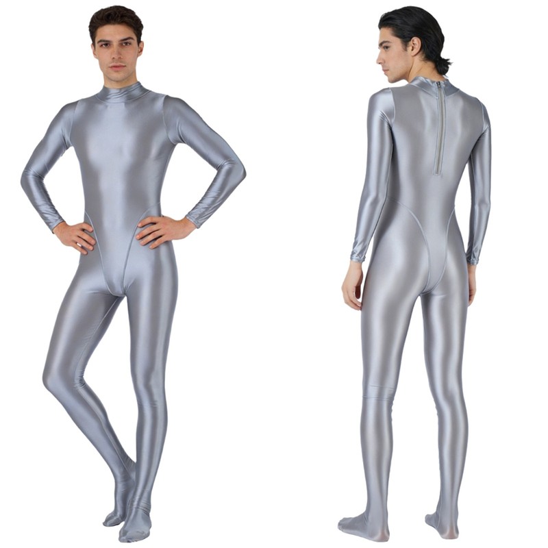 Men’s jumpsuit is designed with mock neck, long sleeve, back zipper closure and slim-fit; and adopted with glossy fabric.