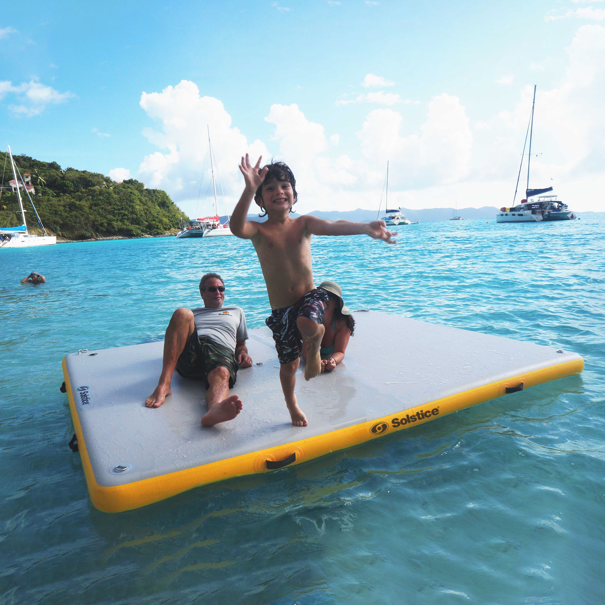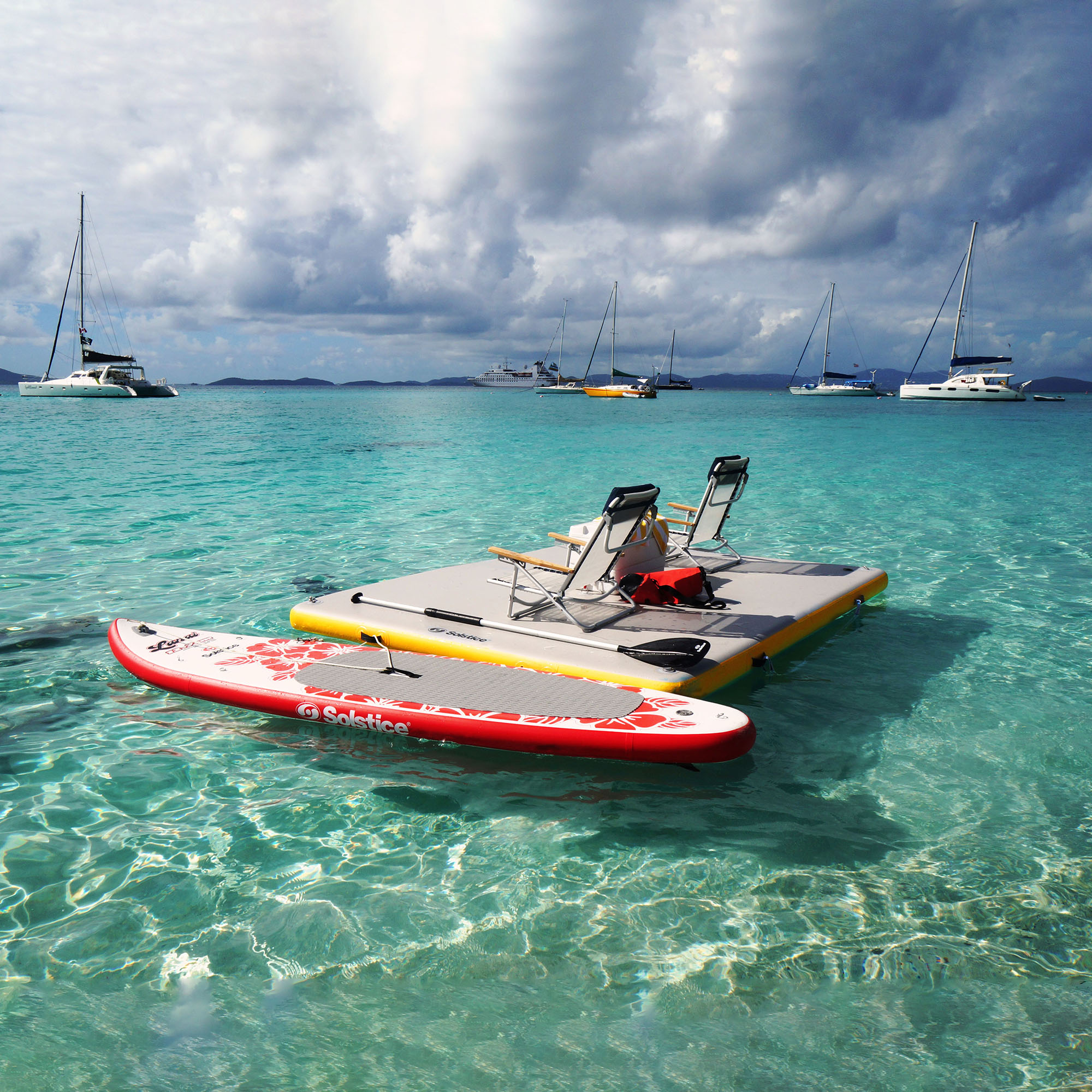 Create your own oasis with this floating dock. This yellow and white dock is perfect for your summertime enjoyment in the sun! Frolic in the water while your friends and family rest with stability in lawn chairs or relax on the deck of the dock. You can add a cooler and water toys for added fun. Dive in the ocean while your belongings are secure and dry.