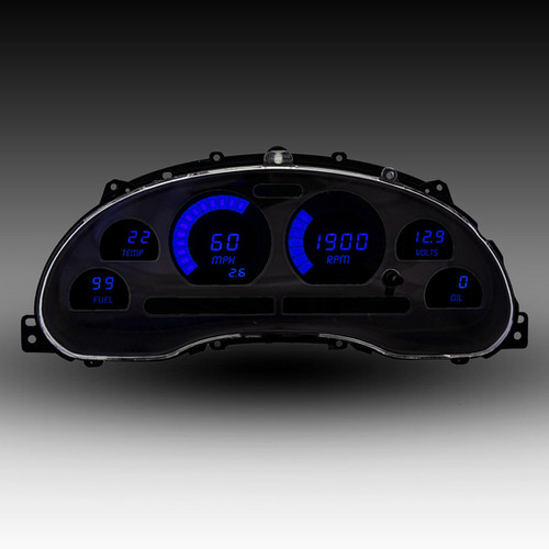 The modernized dash kit comes complete with direct fit printed circuit board, custom fit smoked plexiglass faceplate, universal temperature & oil pressure sending units.