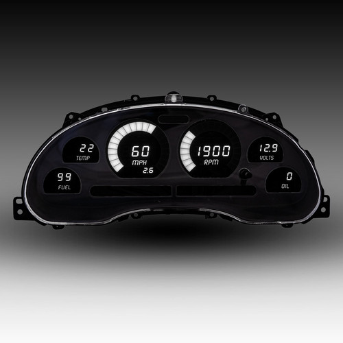 The modernized dash kit comes complete with direct fit printed circuit board, custom fit smoked plexiglass faceplate, universal temperature & oil pressure sending units.