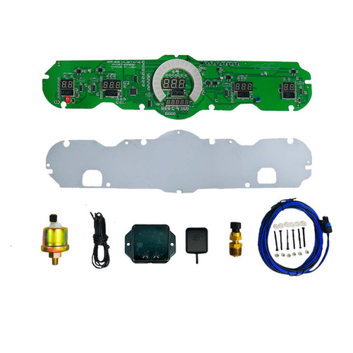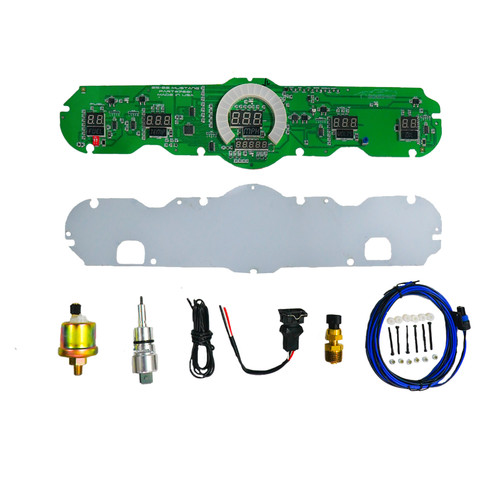 The modernized dash kit comes complete with direct fit printed circuit board, custom fit smoked plexiglass faceplate, universal temperature & oil pressure sending units.