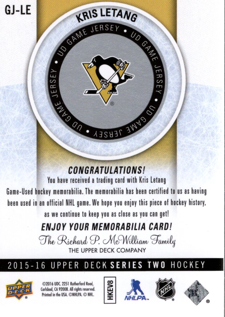 2015-16 Upper Deck Game Jerseys #GJLE Kris Letang 2G Jersey - HKY