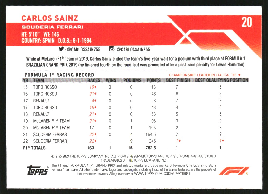 2023 Topps Chrome Formula 1 #20 Carlos Sainz - RAC