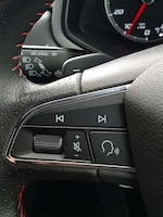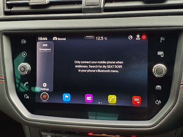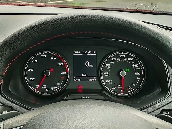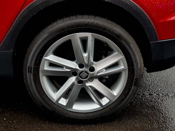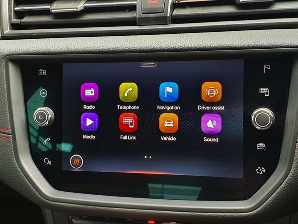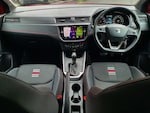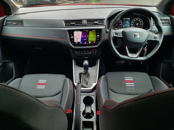 ..'Lights On' Reminder warning buzzer, Cruise control and speed limiter, Digital clock, Electric speed sensitive power steering, Full Link Smartphone Integration with Mirror Link, Apple Car Play, Google Android Auto with USB Type C cable for Apple and Android compatibility, Low fuel warning light, Outside temperature display, Rear parking sensor, RPM counter, Seat connect with safety, service, remote and online, SEAT Drive profile - Four different models normal-sport-eco-individual, steering response, throttle response and gear shifts mode, Trip computer, Sports suspension, Bluetooth interface for hands free and audio streaming, DAB digital radio and AM/FM radio, Steering wheel mounted audio controls, Anti theft roof antenna, Auto dimming interior rear view mirror, Automatic activation of hazard warning lights, Automatic headlights, Body coloured bumpers, Body coloured door handle inserts, Chrome front grille frame, Chrome roof rails, Chrome window trim, Coming/leaving home lighting function, Dark tinted rear windows, Electric front/rear windows with one touch/auto up/down, Electrically adjustable, heated and folding door mirrors, Full LED headlights dipped and mainbeam + front and rear fog lights, LED daytime running lights, LED rear tail lights and licence plate lights, Protective side mouldings, Rain sensing wipers, Rear window wash/wipe, Roof colour door mirrors, Twin exhaust pipe styling hidden exhaust pipe, Visible VIN plate, Windshield wiper with intermittent control and potentiometer, 2 cupholders, 60/40 split folding rear seat, Aircare filter, Black interior roof, Double boot floor, Driver sunvisor with covered mirror + card holder, Dual zone climate control, Front courtesy light with front reading lights, Front sport seats, Gear shift indicator, Height adjustable front seats, Height/reach adjustable steering column, Illuminated boot, Instrument lighting with brightness control, Interior light in footwell, central console and door panel, ISOFIX points in outer rear seats with top tether anchorage points, Multi-colour ambient interior lighting, Nora cloth upholstery, Passenger sunvisor with vanity mirror, Perforated flat bottomed leather steering wheel/gear knob/handbrake with red stitching and FR logo, Steering wheel mounted gearshift paddles, Two front and three rear height adjustable headrests, Connectivity pack plus - Arona, Interior chrome pack - Arona, 3 point seatbelts on all rear seats, ABS, Active front headrests, Child locks on rear