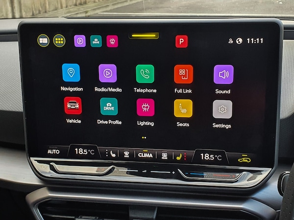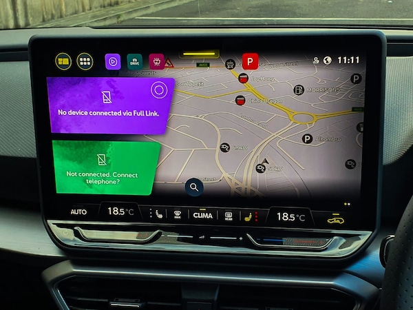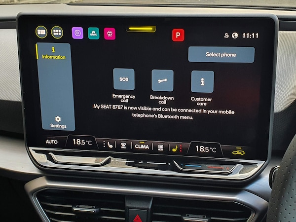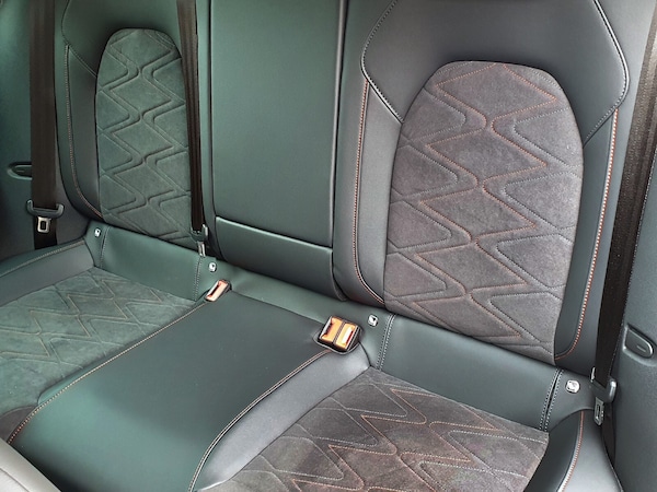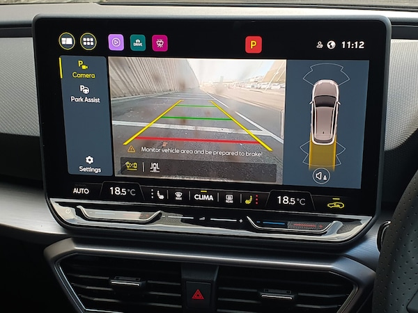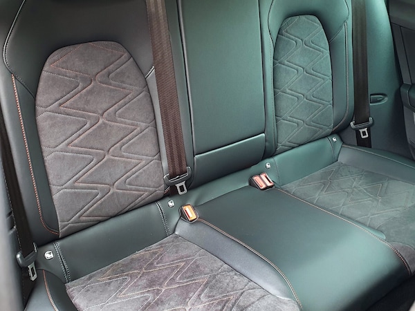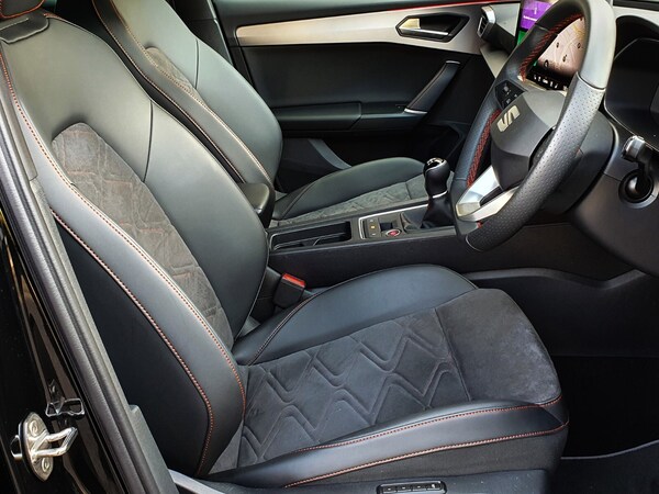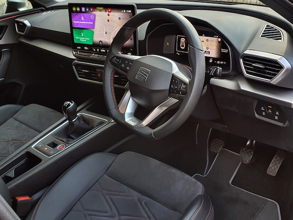 ..Digital cockpit, E-call, Four x USB Type C ports, Front assist with forward collision warning braking reaction to vehicles, pedestrians and cyclists, Full link smartphone integration with Mirror Link, wireless Apple CarPlay and wired Google Android Auto, Lane assist, Lockable tailgate, Park assist (inc front/rear parking sensors), Power assisted speed sensitive electro-mechanical steering, Rear view camera, RPM, trip computer, outside temp gauge, instrument light brightness, low fuel warning light, lights on reminder, gearshift indicator, SEAT drive profile with 4 modes (Eco/Normal/Sport/Individual), throttle response, Service interval indicator, Start/stop system with regenerative braking, Sports suspension, XDS electronic differential lock and dynamic traction support, 7 speakers, Auxiliary input socket, Auto dimming rear view mirror, Body colour door handles, Body coloured bumpers, Dark tinted rear windows, Door mirror LED indicator lights, Dynamic headlight range control, Electric adjustable/heated/folding door mirrors with memory, Electric front/rear windows, FR sports bumper, Illuminated front door sill, LED front fog lamps, LED Headlights with dynamic turn signals, LED tail lights and rear fog lights with rear coast to coast lighting, Matt black roof rails, Rear side wing doors, Rear wash/wipe, Separate daytime running light with automatic headlight control and coming home feature, Third brake light, Welcome light silhouette from exterior mirrors, Windshield wiper intermittent control with light/rain sensor, 12v power point in centre console, 3 seat bench in 2nd row, 60/40 split rear bench seat with armrest, Ambient lighting with glovebox, footwell and single monocolour, Black headlining, Dust/pollen filter, Electric driver lumbar support + passenger manual lumbar support, Front and rear height adjustable headrests, Front and rear reading lights X 4, Front centre armrest, Front seatback storage pockets, Heated front seats, Heated leather steering wheel with leather gearstick, Height/reach adjust steering wheel, Interior wraparound lighting (FR), ISOFIX points in outer rear seats with top tether anchorage points, Luggage tie-down hooks, Microsuede cloth upholstery, Power driver seat with memory and manual height adjustable passenger seat, Single front passenger seat, Sliding boot cover, Sunvisors with covered illuminated mirror, Three zone climate control, Tool kit, Media system plus with navigation - Leon, 3 point seatbelts on all rear seats,