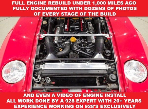 This car has had huge amounts of time and effort spent over recent years to bring it to its current status. Here are some of the highlights for this car: Full engine rebuild under 1,000 miles ago. Fully documented with dozens of photos of every stage of the build and even a video of engine install. All work done by a 928 expert with 20+ years experience working on 928s exclusively. MOT with no advisories less than 100 miles ago. Full set of Gaz adjustable coil-over shocks all round fitted and adjusted 600 miles ago. Porsche Cup wheels refurbished and completely unmarked. All tyres have little wear and 7mm tread. Brake callipers overhauled and painted at a cost of over £1200 EBC Yellow Stuff brake pads all round. Radtec all alloy high capacity radiator fitted - coolant flushed and changed regularly on this engine. Engine projection chassis skid plates fitted. Engine is of course ultra clean and does not leak oil. Only Valvoline VR1 Racing 20W50 oil used - high ZDDP oil ideal for these engines. Air Conditioning - brand new BEHR condenser fitted and system converted to R134A gas Complete interior retrim of all seats in two tone leather - Black with perforated ivory centre sections, red stitching. Hi-Fi head unit upgraded and with Aux and USB inputs, speakers upgraded with modern Blaupunkt units. Full carpets, genuine black Sliverknit wool fitted throughout. Genuine Porsche ClubSports steering wheel fitted. LaserLine Thatcham Cat.1 Alarm system including remote fob for alarm and central locking. Spare key and spare fobs included. 928 GTS Aero mirrors, fully electric and working with the seat memory settings. Rear spoiler is gloss black and it is the ultra rare flip up type spoiler. LED upgrade to interior door lights and front running lights. New door seals fitted (later wiper type) including the commonly ruined window scrapers (all genuine parts). Ritech X-Pipe exhaust fitted at front, TEquipment RMB at the rear. Sounds absolutely great without being loud. Ritech Flexplate Clamp fitted. New Bosch fuel pump and filter fitted 2023. Billet rebuildable fuel pressure dampers and fuel pressure regulator fitted. New high pressure fuel pipe fitted (front of engine). Last service was December 2025 and under 100 miles ago. Last cambelt / water pump change Sept 2023. If you are at all familiar with 928s you will see that all the troublesome things have been addressed and this car needs nothing now other than enjoying ! The car comes with two massive f.