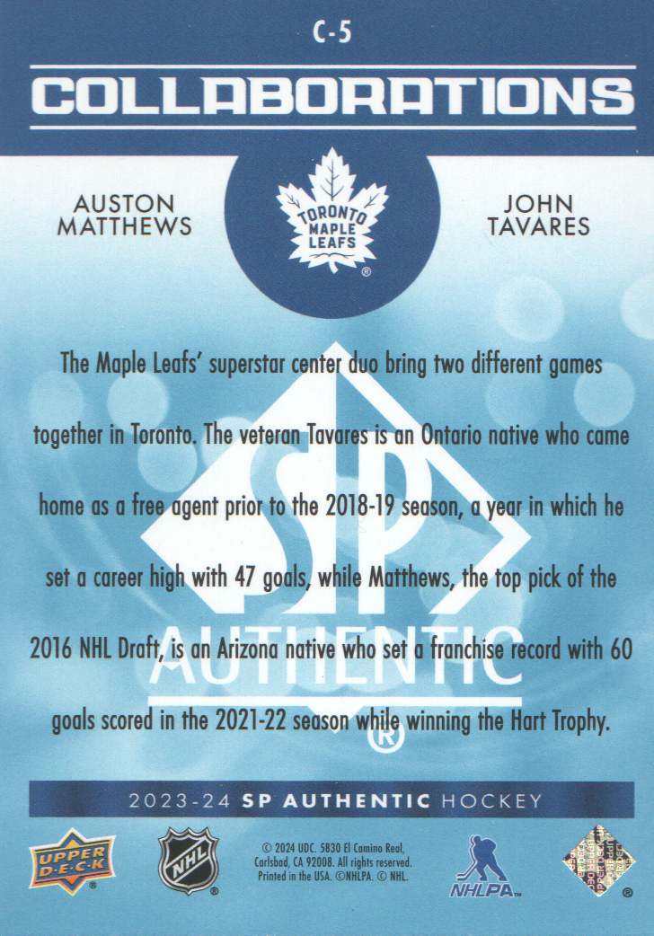 2023-24 SP Authentic Collaborations Blue #C5 Auston Matthews John Tavares - HKY