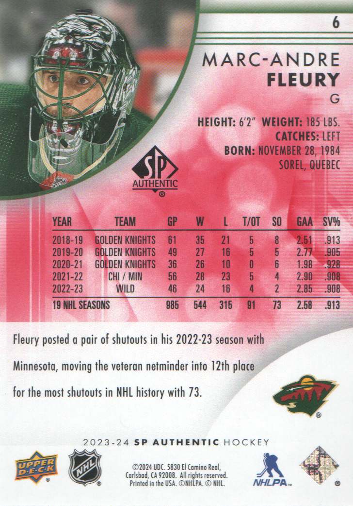 2023-24 SP Authentic Limited Red #6 Marc-Andre Fleury - HKY
