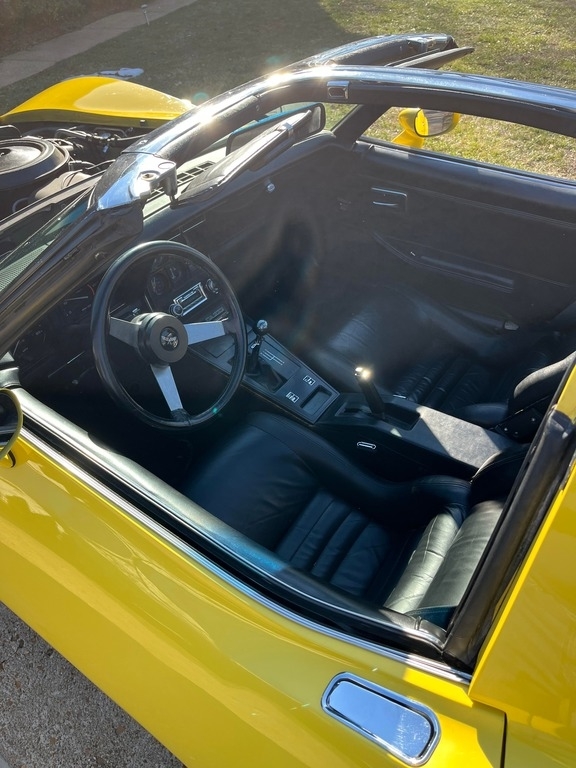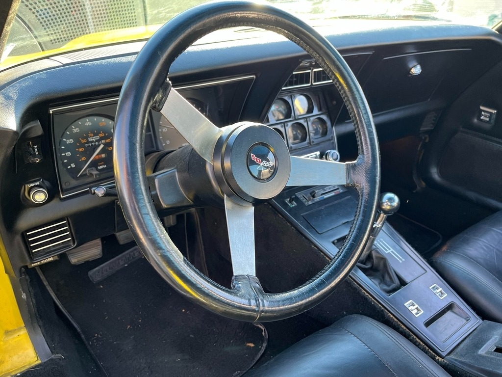 This Corvette is a numbers matching "True Survivor" and is powered by a 350 V8 engine paired with a 4-speed manual transmission. It has 77,732 miles and is shown with a yellow exterior and black leather interior. This vehicle has been garage-kept and well-maintained.