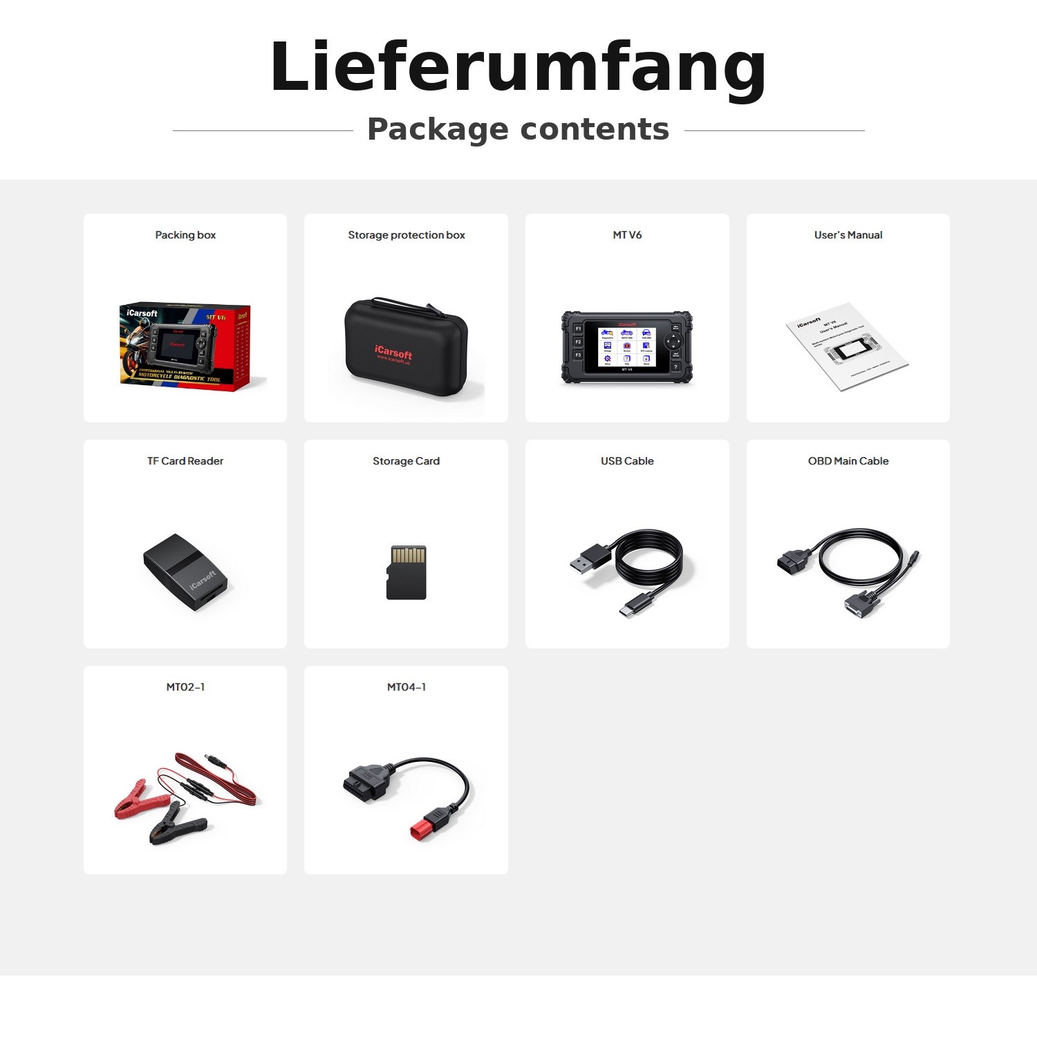 Bei Piaggio-Motorrädern unterstützt der MT V6 typischerweise die Modelle mit elektronischer Einspritzung ab ca. Baujahr 2010, sofern sie über einen OBD-II-Diagnoseanschluss verfügen. Ältere Vergaser-Bikes oder Fahrzeuge ohne Diagnosestecker sind nicht abgedeckt. Zu den gängigen kompatiblen Baureihen zählen MP3, Beverly, Medley, Liberty, Piaggio 1, Zip.