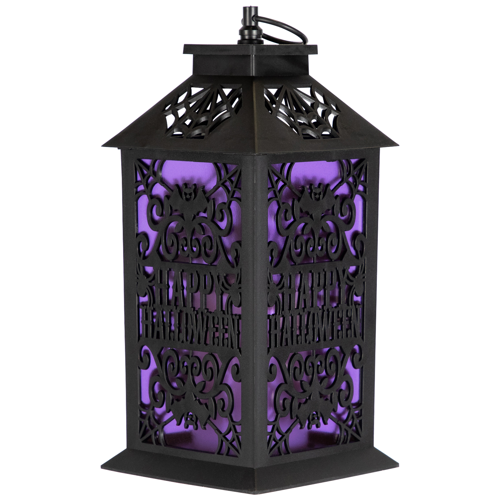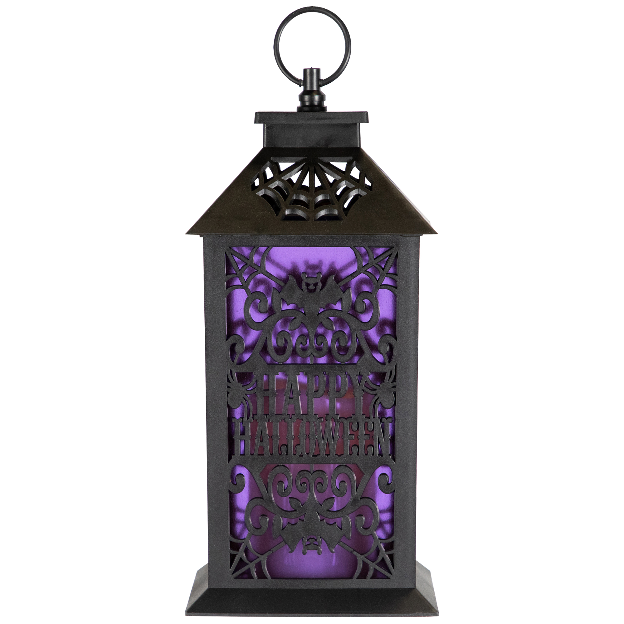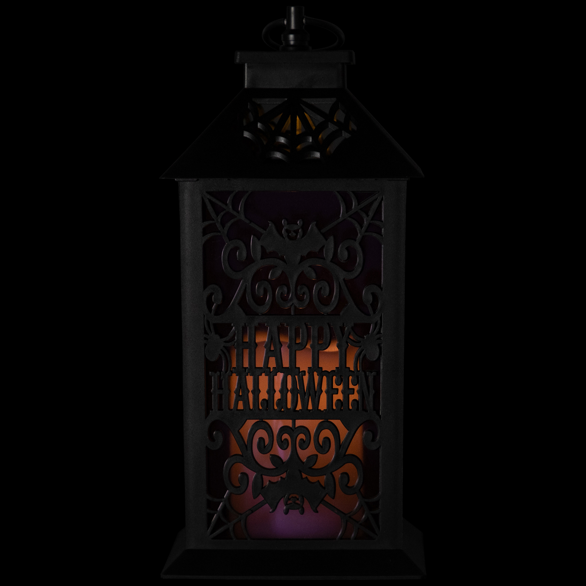 Set the scene for a spooky night with this LED black lighted bats "Happy Halloween" candle lantern. This striking Halloween lantern is designed with cut-out spiderwebs, swooping bats, and ornate scroll patterns that cast haunting silhouettes when lit. Inside, a flameless pillar candle glows with a flickering warm white LED light, creating the realistic look of candlelight without the mess of wax or open flame. The words "Happy Halloween" are featured prominently on the lantern, making it a perfect decorative accent for tabletops, mantels, porches, or entryways. Whether used alone as a focal point or paired with other Halloween décor, the lantern adds a mysterious glow that enhances any spooky setting. Its classic black finish blends seamlessly with a variety of Halloween themes, from gothic elegance to fun, family-friendly displays. Crafted for both safety and style, this LED Halloween candle lantern is battery-operated and easy to place anywhere you need a touch of haunted ambiance. Durable construction ensures it can be enjoyed year after year, while the timeless design with bats and spiderwebs captures the essence of Halloween night. Ideal for indoor or covered outdoor use, this lantern is a must-have piece to complete your haunted house home décor.