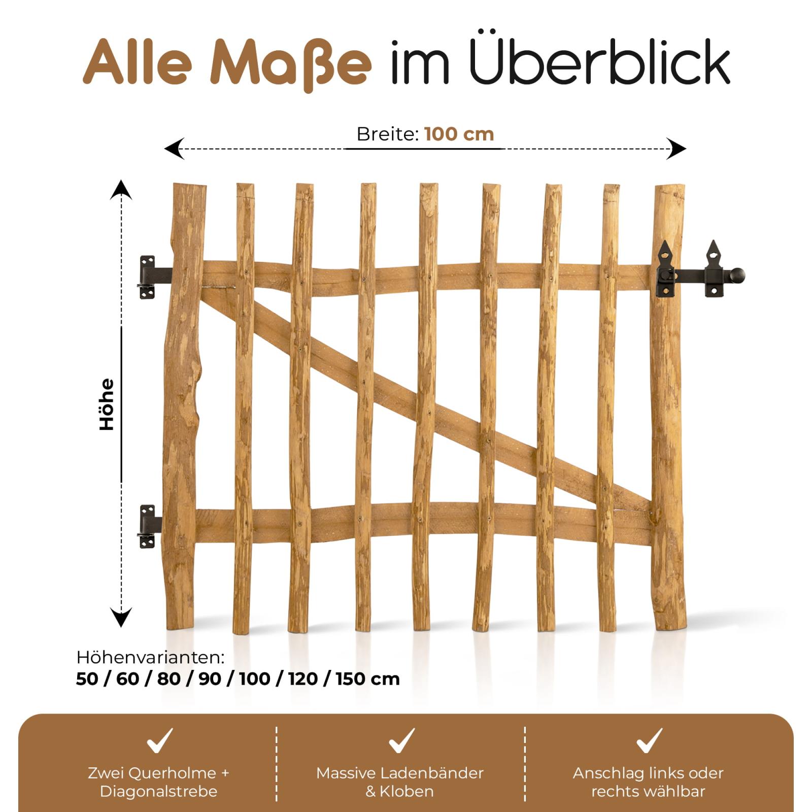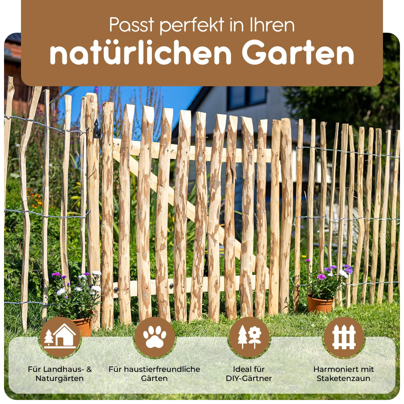 Il nostro cancello da giardino è l'aggiunta perfetta alla vostra staccionata per creare un ingresso adeguato. Il cancello a picchetto può essere utilizzato come cancello per il vostro giardino anteriore, come porta del cortile della vostra proprietà o come accesso per i vostri animali da fattoria. Con i nostri cancelli per recinzione in nocciole potrete anche completare in modo ottimale ed espandere in modo funzionale il vostro giardino agricolo. I nostri cancelli da giardino sono realizzati a mano, quindi ogni cancello è unico.