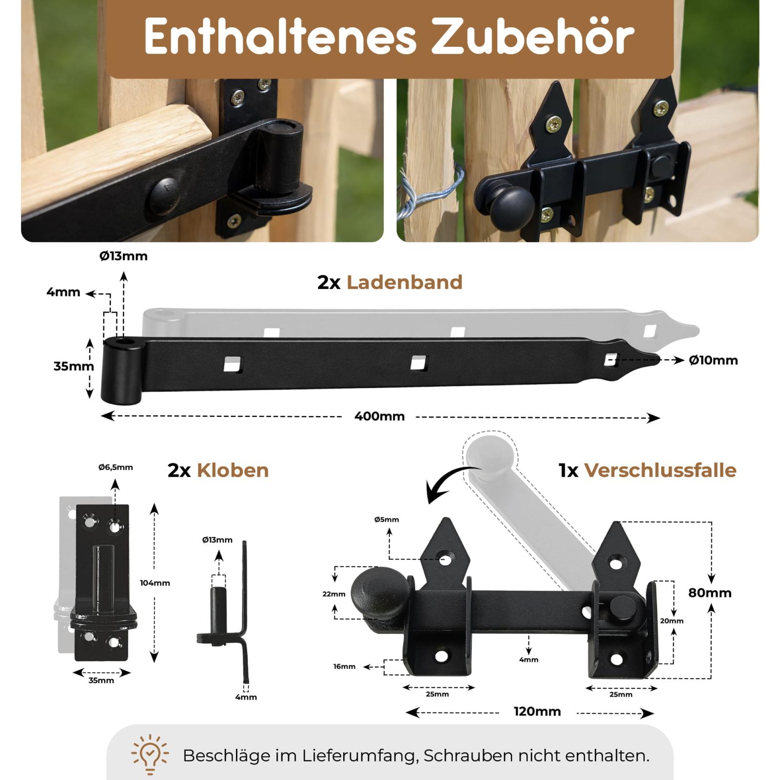 Le viti variano notevolmente da cliente a cliente, quindi non sono incluse. A partire da un'altezza di 120 cm invieremo il vostro cancello da giardino tramite spedizioniere. Per concordare con te una data di consegna, la nostra compagnia di spedizioni ha bisogno di un numero di telefono. Si prega di specificarlo durante il processo di acquisto.