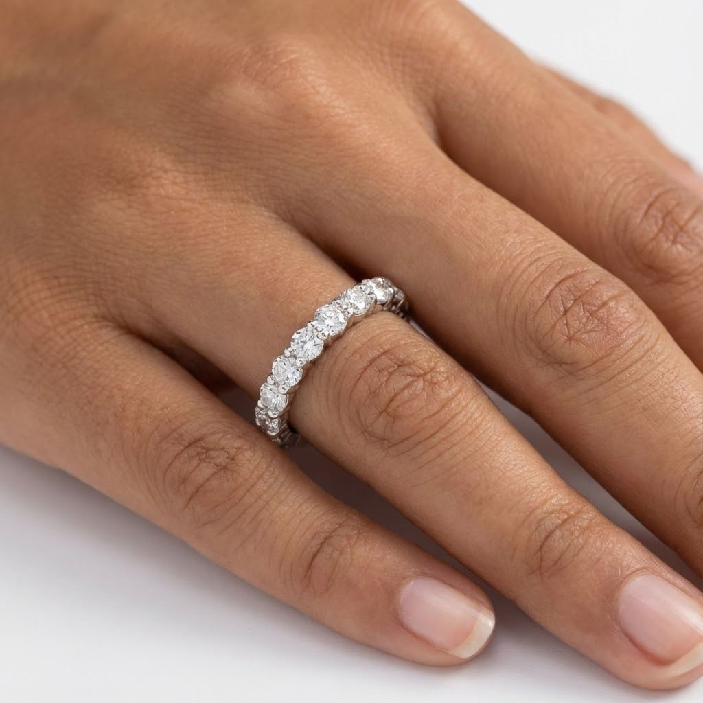 Celebrate your love with this exquisite classic eternity wedding band, beautifully designed with shared-prong settings that enhance the luxurious allure of lab-grown round diamonds. Perfect for anniversaries or as a symbol of endless commitment, this timeless piece embodies durability and elegance. With its impeccable craftsmanship, it glimmers with brilliance and is a meaningful investment that will bring joy for years to come. Cherish each milestone with this stunning representation of your enduring love story.
