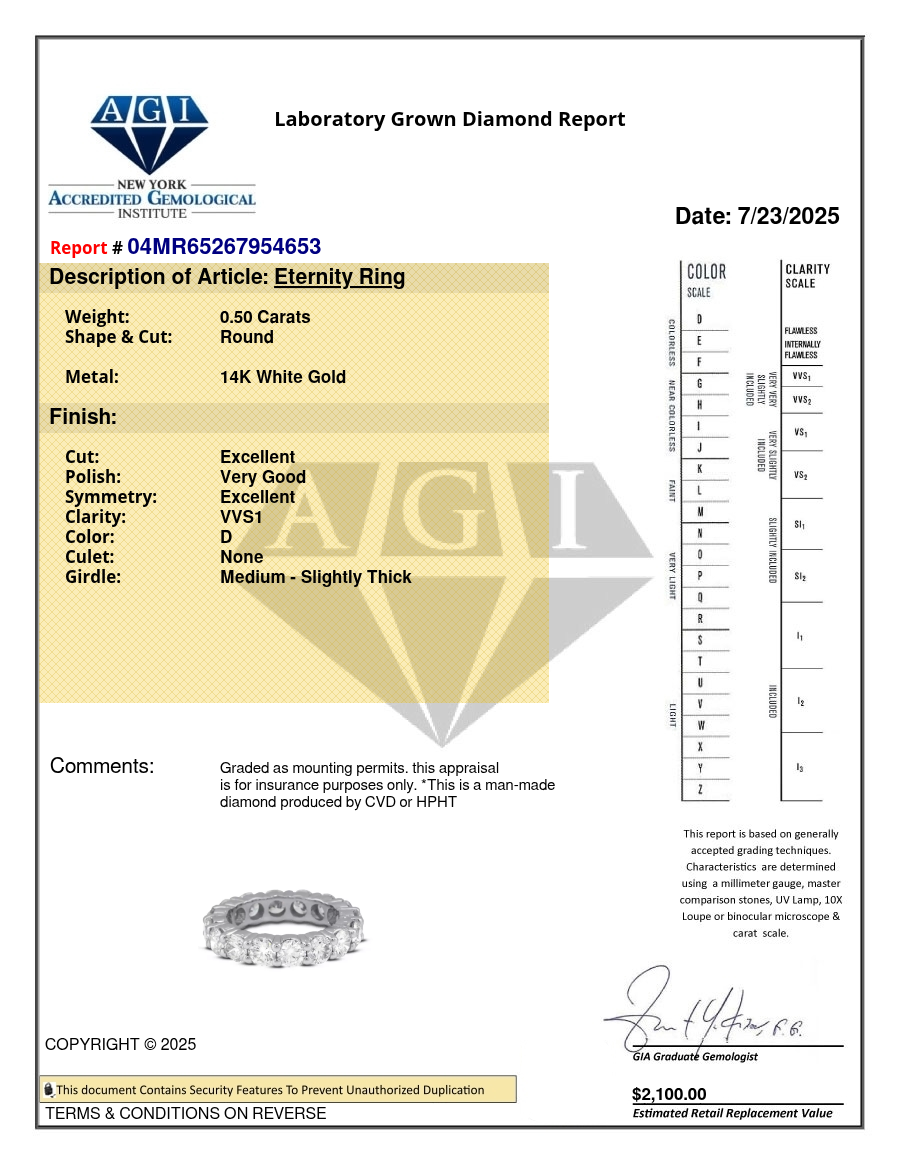 Solid 14K White Gold Eternity Wedding Ring Classic AGI Cert 0.50 CT Round Lab-Grown Diamond D VVS1